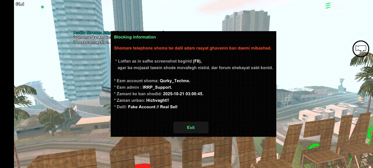 بنده ی اشتباهی کردم یک اکانتی خریدم به نام Arvin_Techno و بن شدم به دلیل فیک اکانت ریعسل و اکانت اصلی مو زدم به نام شماره ای که به نام خودمه به نام اکانت Qurky_Techno ولی متاسفانه بن شدم و خواهش مندم آن بن بشم و معذرت خواهی میکنم از مدیریت های سرور و ادمین ها و مالک ها و میخام منو ببخشن و دیگه همچنین کاری تکرار نکنم الان ۳ ماه خوردگی در سرور نیستم ولی رفیقام هستن دوست دارم دوباره بگردم ممنونم از همتون ..