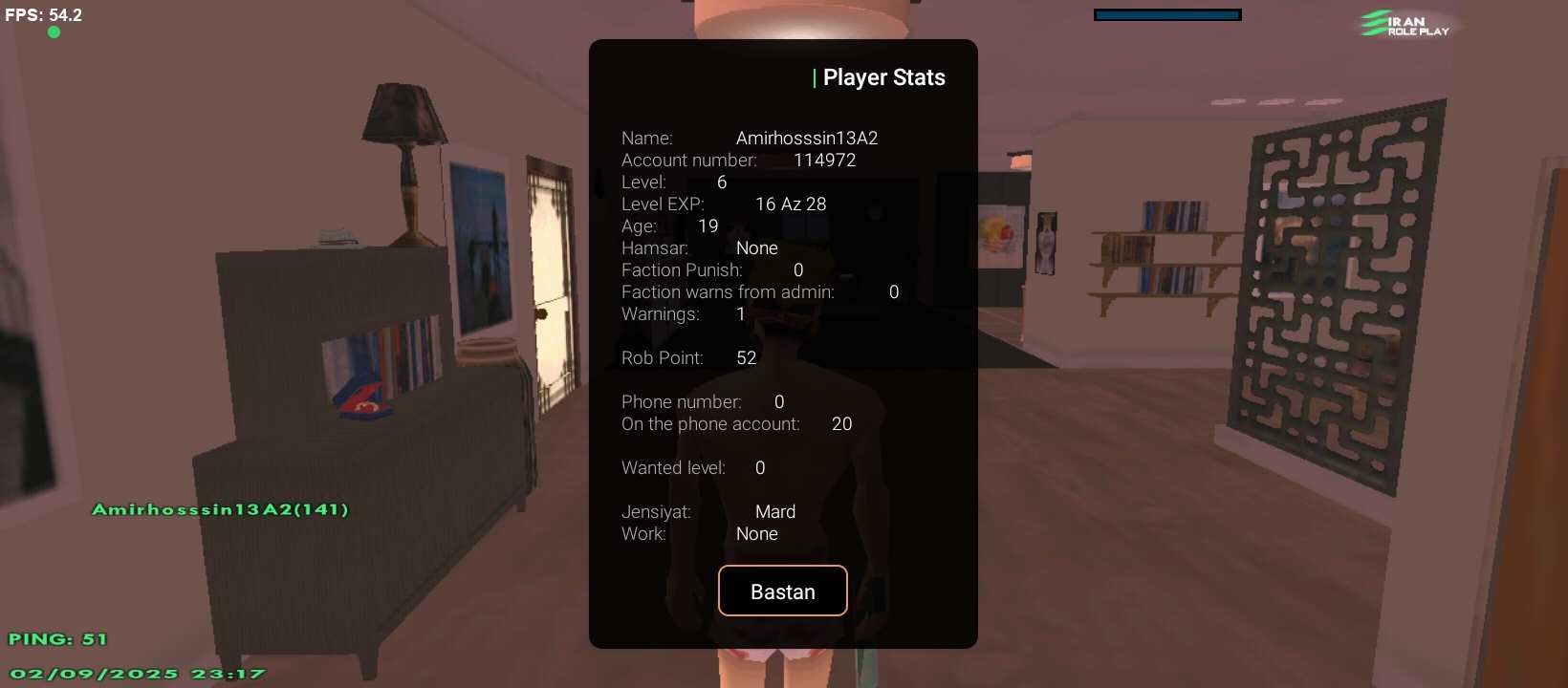 1. نام حساب کاربری شما : Amirhosssin13A2 2 - سطح حساب کاربری شما :6 ۳ - سن شخصیت حساب کاربری شما :14 4 - سوابق خود را در سازمان های جنایی شرح دهید :ندارم توجه : عکس از wbook/ و stats/ حساب کاربری خود را حتما در پیام ارسال فرم بارگذاری کنید./guest/2025/09/02/175684248197021.jpg اطلاعات OOC 1 - آیدی تلگرام :09309141529 به این شماره پیام دهید 2 - آیدی دیسکورد :ندارم 3 - مقدار تایم پلی روزانه :۸ یا ۹ ساعت 4 - در چه حد از رول پلی آگاهی دارید و به قوانین آن مسلط هستید ؟درحد نیاز 5 - در چه حد با نحوه کارکرد سایت انجمن آشنایی دارید ؟درحد نیاز 🔸در صورتی که رهبر مربوطه شما را انتخاب کند، با شما در قسمت پیام های شخصی انجمن در ارتباط خواهد بود🔸