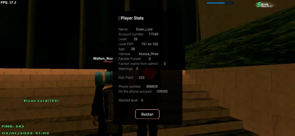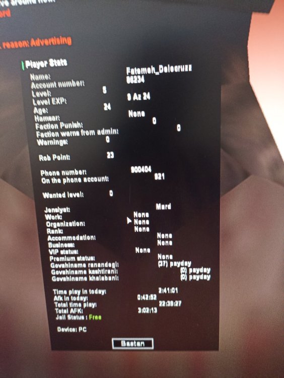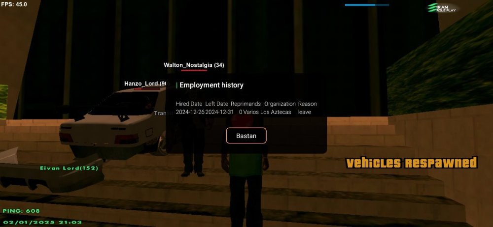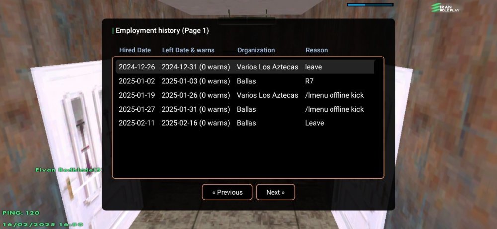 - نام حساب کاربری شما : Eivan_Lord 2 - سطح حساب کاربری شما : 39 ۳ - سن شخصیت حساب کاربری شما : 38 4 - سوابق خود را در سازمان های جنایی شرح دهید : Aztecas leave Balas R7 Aztecas /menu offline kick توجه : عکس از wbook/ و stats/ حساب کاربری خود را حتما در پیام ارسال فرم بارگذاری کنید. اطلاعات OOC 1 - آیدی تلگرام : @justdiemen 2 - آیدی دیسکورد : BEST_FLASH 3 - مقدار تایم پلی روزانه : 2+ 4 - در چه حد از رول پلی آگاهی دارید و به قوانین آن مسلط هستید ؟ زیاد 5 - در چه حد با نحوه کارکرد سایت انجمن آشنایی دارید ؟ زیاد -