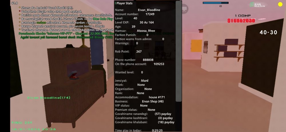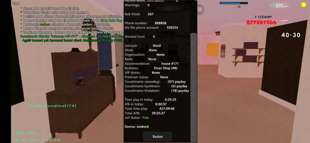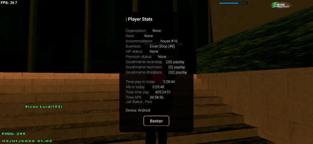 اطلاعات IC 1 - نام حساب کاربری شما : Eivan_Bloodline 2 - سطح حساب کاربری شما : 40 ۳ - سن شخصیت حساب کاربری شما : 39 4 - سوابق خود را در سازمان های جنایی شرح دهید : Acztecas /leave Ballas R7 Aztecas offline kick Ballas offline kick توجه : عکس از wbook/ و stats/ حساب کاربری خود را حتما در پیام ارسال فرم بارگذاری کنید. اطلاعات OOC 1 - آیدی تلگرام : @justdiemen 2 - آیدی دیسکورد : BEST_FLASH 3 - مقدار تایم پلی روزانه : 2 4 - در چه حد از رول پلی آگاهی دارید و به قوانین آن مسلط هستید ؟ کامل 5 - در چه حد با نحوه کارکرد سایت انجمن آشنایی دارید ؟ کامل -