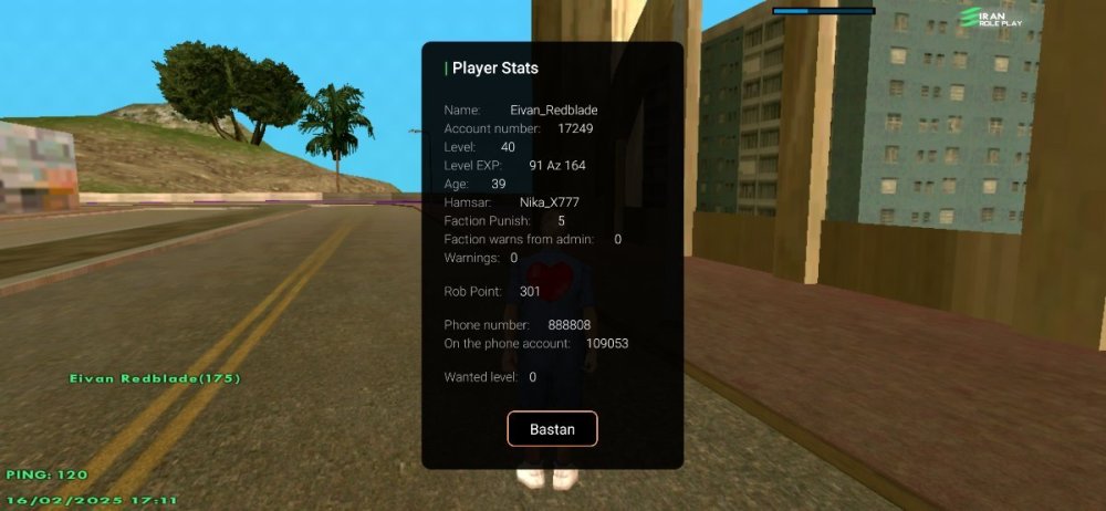اطلاعات IC 1 - نام حساب کاربری شما : Eivan_Lord 2 - سطح حساب کاربری شما : 40 ۳ - سن شخصیت حساب کاربری شما : 39 4 - سوابق خود را در سازمان های جنایی شرح دهید : Aztacs leave Ballas R7 توجه : عکس از wbook/ و stats/ حساب کاربری خود را حتما در پیام ارسال فرم بارگذاری کنید. اطلاعات OOC 1 - آیدی تلگرام : @justdiemen 2 - آیدی دیسکورد : BEST_FLASH 3 - مقدار تایم پلی روزانه : 2+ 4 - در چه حد از رول پلی آگاهی دارید و به قوانین آن مسلط هستید ؟ زیاد 5 - در چه حد با نحوه کارکرد سایت انجمن آشنایی دارید ؟ زیاد -