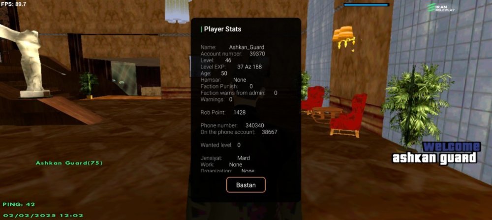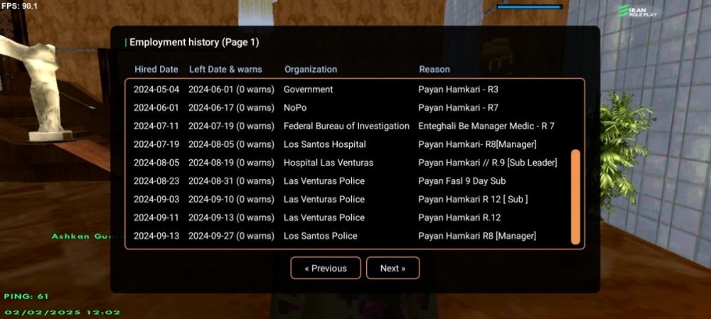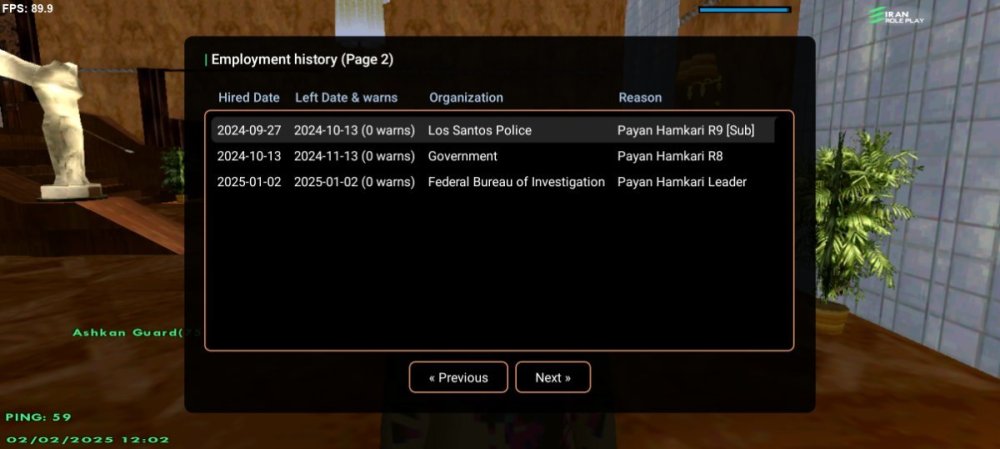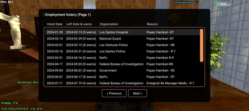 1- نام اکانت :Stephen_Guard 2- لول : 49 ۳- سن اکانت :53 4- سابقه شما در اقلیت های دولتی (به همراه رنک ها) :Medic [R7] Payan Hamkari Army [R7] Payan Hamkari Lvpd [R8] Payan Hamkari Lspd [R7] Payan Hamkari Nopo [R9] Payan Hamkari Fbi [R8] Payan Hamkari Government [R3] Payan Hamkari Nopo [R7] Payan Hamkari Fbi [R7] Enteghali Be Manager Medic Ls Medic [R8] Payan Hamkari [Manager] Lv Medic [R9] Payan Hamkari [Sub] Lv Pd [R12] Payan Hamkari [Sub] Lv Pd [R12] Payan Hamkari [Sub] Ls Pd [R8] Payan Hamkari [Manager] Lsp Pd [R9] Payan Hamkari [Sub] Government [R8] Payan Hamkari [Vazir] Fbi Payan Hamkari [Leader] Nopo Payan Hamkari [Leader] Lspd Payan Hamkari [Leader] [Top] Fbi Payan Hamkari [Leader] توجه : عکس از wbook/ و stats اکانت خود را در پیام ارسال فرم آپلود کنید. ( اگر درحال حاضر در سازمانی هستید اسم فکشن و رنکتون هم ارسال کنید ) اطلاعات OOC 1- نام واقعی شما :اشکان 2- سن واقعی شما :19 3- آیدی تلگرام :@Night_Ghostc 4 - آیدی دیسکورد :Stephen_Guard 5- مقدار تایم پلی روزانه :4 به بالا 6- هدف شما از لیدری چیست ؟کسب تجربه و تاپ فکشن و لیدری 7- اگر لیدر بشید قدرت و وقت کافی برای اداره اقلیت و کنترل بازیکنان داخل اقلیت را دارید ؟بله کاملاً 8- چه مقدار ارپی بلدید و چه مقدار به قوانین ارپی مسلط هستید :کاملاً 9- آیا تا به حال برترین کارمند هفته دولتی بودهاید؟ و اگر بودهاید تعداد را بنویسید. 1 10- در چه حد با فروم آشنایی دارید ؟کامل 11- بر چه اساس عضو خواهید گرفت ؟ معیار شما برای عضوگیری چیست ؟ چه کسانی را وارد تیم میکنید ؟ 1- داشتن سابقه کافی 2-داشتن وقت 3-داشتن اخلاق و ادب 4-آگاهی از قوانین آرپی و فکشن 12- رقابت برای ورود به فکشن ها بسیار است ، به چه صورتی میتوانید پلیر های بیشتری را جذب کنید ؟ 1-تبلیغ در چت /gov 2_برگزاری ایونت در فکشن 13- فرض کنید لیدر هستید ، ایده هایی که برای بهبود سازمان ها اجرا خواهید کرد را بصورت کوتاه بیان کنید : 1-برکزاری ایونت برای رقابت دوستانه بین ممبرها 2-جایزه دادن به ممبر برتر 3-برگزاری متینگ در گیم و دیسکورد برای مرور نکات 4-روند آرپی پیش گرفتن 5-انتخاب ساب و منیجر برای کمک به سازمان و ممبرها 6-متینگ مشترک -