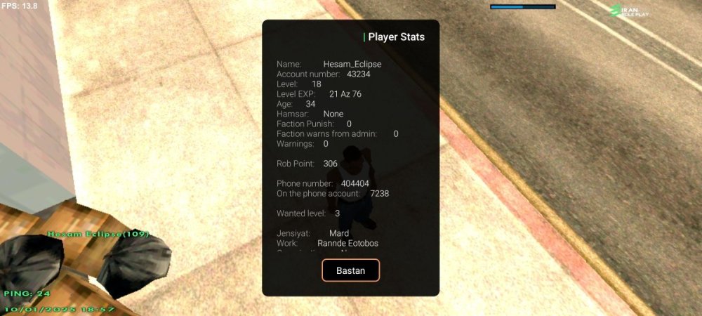 6. - نام حساب کاربری شما :Hesam_Eclipse 2 - سطح حساب کاربری شما :18 ۳ - سن شخصیت حساب کاربری شما : 34 4 - سوابق خود را در سازمان های جنایی شرح دهید : بالاس بودم یکسال پیش که لف دادم R4 توجه : عکس از wbook/ و stats/ حساب کاربری خود را حتما در پیام ارسال فرم بارگذاری کنید. اطلاعات OOC 1 - آیدی تلگرام :H878787 2 - آیدی دیسکورد :h878787 3 - مقدار تایم پلی روزانه : نسبی هست ولی هر روز گیم هستم یک روز ممکنه خیلی داخل گیم باشم یه روز ممکنه کم باشم میانگینش ۲ تا ۴ ساعته 4 - در چه حد از رول پلی آگاهی دارید و به قوانین آن مسلط هستید ؟ کامل 5 - در چه حد با نحوه کارکرد سایت انجمن آشنایی دارید ؟ کامل