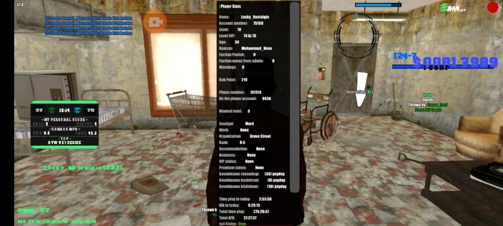 اطلاعات اکانت شما (Level، رنک و فکشن فعلی شما در سرور):Level 18 Grove Street R7