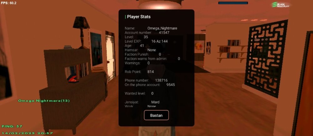 6. درخواست عضویت در گنگ San Fierro Rifa ❓راهنما : جهت درخواست عضویت در گنگ San Fierro Rifa فرم زیر را پر کرده سپس در همین بخش ارسال نمایید. اطلاعات IC 1 - نام حساب کاربری شما : Omega_Nightmare 2 - سطح حساب کاربری شما : 36 ۳ - سن شخصیت حساب کاربری شما : 41 4 - سوابق خود را در سازمان های جنایی شرح دهید : توجه : عکس از wbook/ و stats/ حساب کاربری خود را حتما در پیام ارسال فرم بارگذاری کنید. اطلاعات OOC 1 - آیدی تلگرام : @Omega_Nightmare 2 - آیدی دیسکورد : @Alireza_Shytan. 3 - مقدار تایم پلی روزانه : 4+ 4 - در چه حد از رول پلی آگاهی دارید و به قوانین آن مسلط هستید ؟ full 5 - در چه حد با نحوه کارکرد سایت انجمن آشنایی دارید ؟ full 🔸در صورتی که رهبر مربوطه شما را انتخاب کند، با شما در قسمت پیام های شخصی انجمن در ارتباط خواهد بود🔸