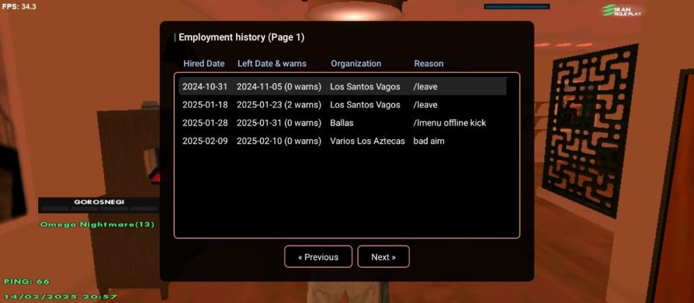 18. درخواست عضویت در گنگ Varrios Los Aztecas ❓راهنما : جهت درخواست عضویت در گنگ Varrios Los Aztecas فرم زیر را پر کرده سپس در همین بخش ارسال نمایید. اطلاعات IC 1 - نام حساب کاربری شما : Omega_Nightmare 2 - سطح حساب کاربری شما : 34 ۳ - سن شخصیت حساب کاربری شما : 40 4 - سوابق خود را در سازمان های جنایی شرح دهید : توجه : عکس از wbook/ و stats/ حساب کاربری خود را حتما در پیام ارسال فرم بارگذاری کنید. اطلاعات OOC 1 - آیدی تلگرام : @Omega_Nightmare 2 - آیدی دیسکورد : @Alireza_Shytan. 3 - مقدار تایم پلی روزانه : 4+ 4 - در چه حد از رول پلی آگاهی دارید و به قوانین آن مسلط هستید ؟ کامل 5 - در چه حد با نحوه کارکرد سایت انجمن آشنایی دارید ؟ کاملاً آشنایی دارم 🔸در صورتی که رهبر مربوطه شما را انتخاب کند، با شما در قسمت پیام های شخصی انجمن در ارتباط خواهد بود🔸