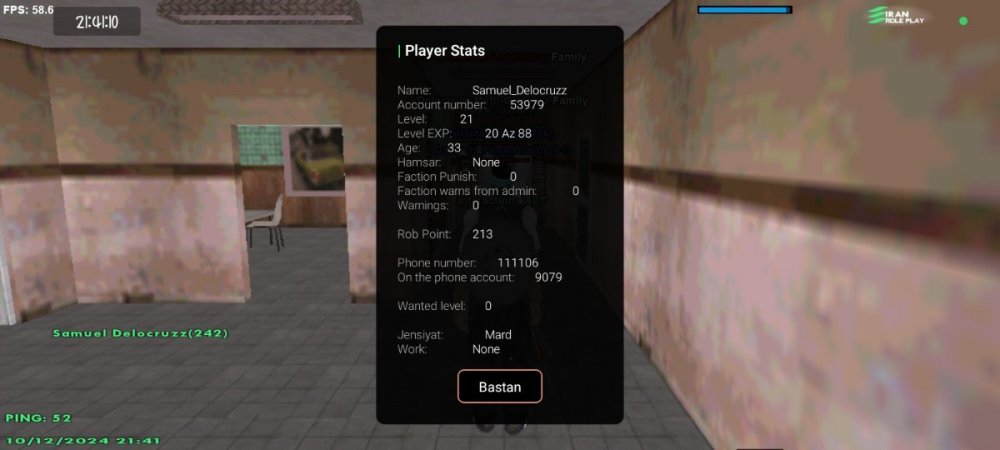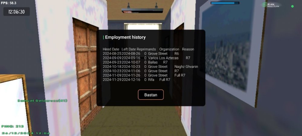 اطلاعات IC 1 - نام حساب کاربری شما : Kabus_Delocruzz 2 - سطح حساب کاربری شما : 8 ۳ - سن شخصیت حساب کاربری شما : 38 4 - سوابق خود را در سازمان های جنایی شرح دهید : Aztecas Full/R7 Grove Full/R7 Rifa Full/R7 Vagos Off Kik Grove Full/R7 Ballas Full/R7 توجه : عکس از wbook/ و stats/ حساب کاربری خود را حتما در پیام ارسال فرم بارگذاری کنید. اطلاعات OOC 1 - آیدی تلگرام : @Kakimaru 2 - آیدی دیسکورد : x 3 - مقدار تایم پلی روزانه : 3 - 2 4 - در چه حد از رول پلی آگاهی دارید و به قوانین آن مسلط هستید ؟ کامل 5 - در چه حد با نحوه کارکرد سایت انجمن آشنایی دارید ؟ کامل -