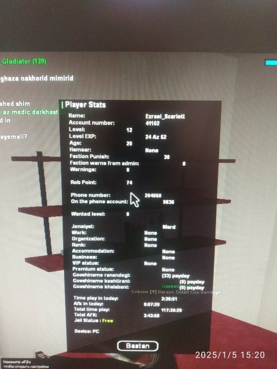 5. اطلاعات IC 1 - نام حساب کاربری شما : Dante_Delocruzz 2 - سطح حساب کاربری شما : 13 ۳ - سن شخصیت حساب کاربری شما :20 4 - سوابق خود را در سازمان های جنایی شرح دهید : ballas aztecas ballas توجه : عکس از wbook/ و stats/ حساب کاربری خود را حتما در پیام ارسال فرم بارگذاری کنید. اطلاعات OOC 1 - آیدی تلگرام :@servezi 2 - آیدی دیسکورد : @servezi 3 - مقدار تایم پلی روزانه : 5 4 - در چه حد از رول پلی آگاهی دارید و به قوانین آن مسلط هستید ؟full 5 - در چه حد با نحوه کارکرد سایت انجمن آشنایی دارید ؟ full