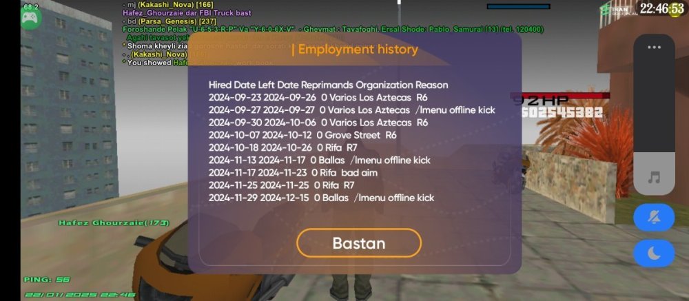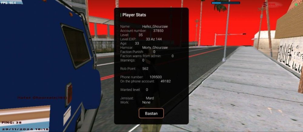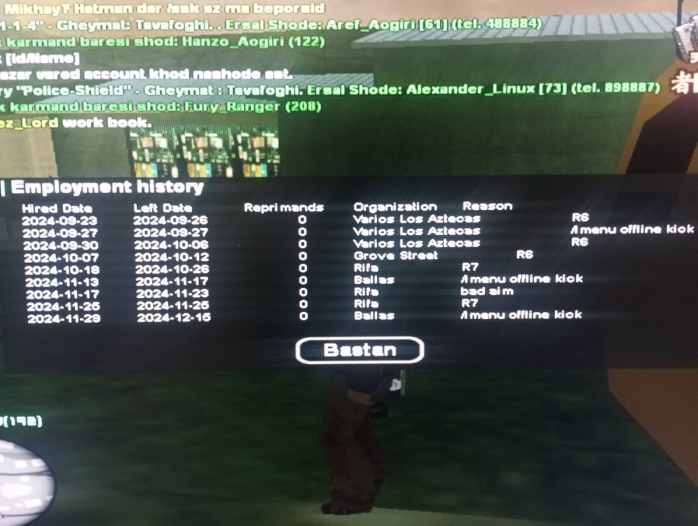 4. اطلاعات IC 1 - نام حساب کاربری شما: Hafez_Ghourzaie 2 - سطح حساب کاربری شما : 35 ۳ - سن شخصیت حساب کاربری شما 33 4 - سوابق خود را در سازمان های جنایی شرح دهید : داخل شات هست اطلاعات OOC 1 - آیدی تلگرام @Bianakk 2 - آیدی دیسکورد : 3 - مقدار تایم پلی روزانه :3الی۷