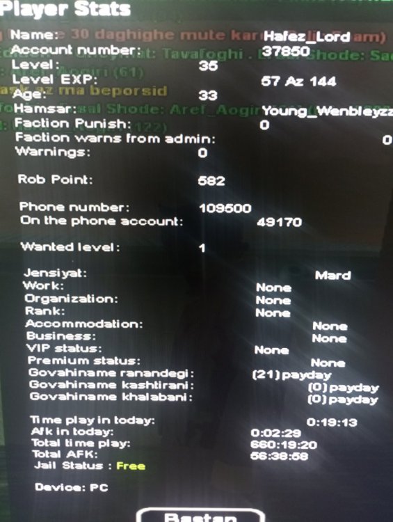 7. اطلاعات IC 1 - نام حساب کاربری شما: Hafez_Lord 2 - سطح حساب کاربری شما : 35 ۳ - سن شخصیت حساب کاربری شما 33 4 - سوابق خود را در سازمان های جنایی شرح دهید : داخل شات هست اطلاعات OOC 1 - آیدی تلگرام Hafez_200@ 2 - آیدی دیسکورد : 3 - مقدار تایم پلی روزانه :3الی۷
