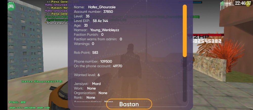 5. اطلاعات IC 1 - نام حساب کاربری شما: Hafez_Ghourzaie 2 - سطح حساب کاربری شما : 35 ۳ - سن شخصیت حساب کاربری شما 33 4 - سوابق خود را در سازمان های جنایی شرح دهید : داخل شات هست اطلاعات OOC 1 - آیدی تلگرام Hafez_200@ 2 - آیدی دیسکورد : 3 - مقدار تایم پلی روزانه :3الی۷