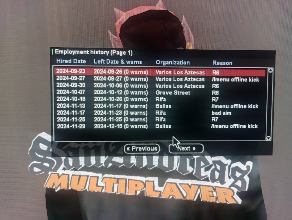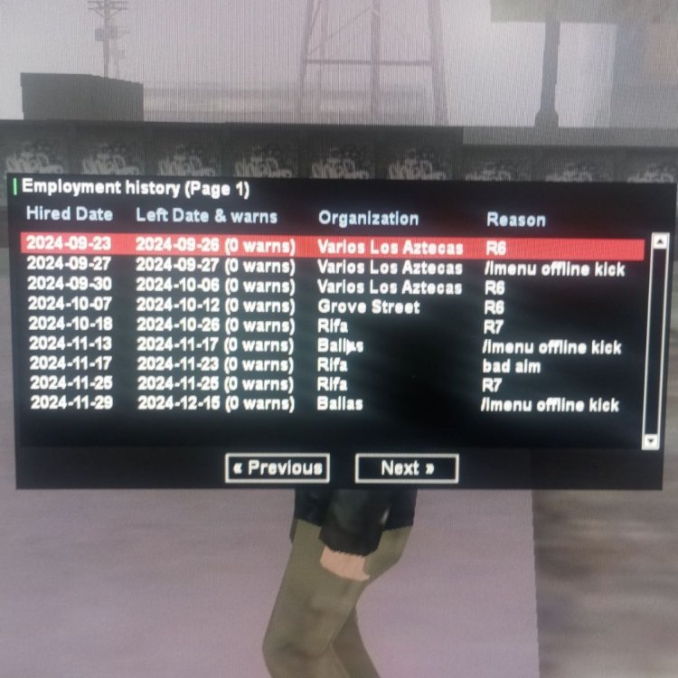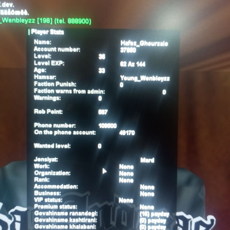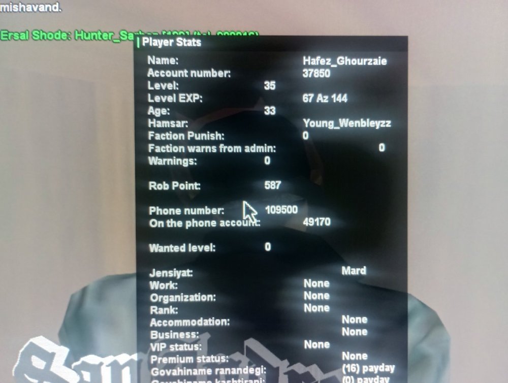 6. اطلاعات IC 1 - نام حساب کاربری شما: Hafez_Ghourzaie 2 - سطح حساب کاربری شما : 35 ۳ - سن شخصیت حساب کاربری شما 33 4 - سوابق خود را در سازمان های جنایی شرح دهید : داخل شات هست اطلاعات OOC 1 - آیدی تلگرام Hafez_200@ 2 - آیدی دیسکورد : 3 - مقدار تایم پلی روزانه :3الی۷