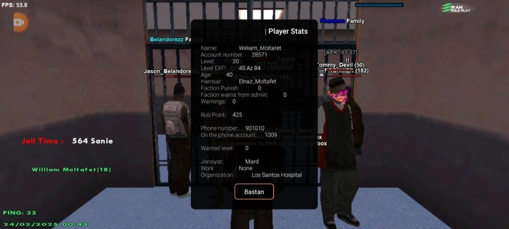 1. اطلاعات IC 1 - نام حساب کاربری شما :Stephen_Moltafet 2 - سطح حساب کاربری شما :25 3 - سن شخصیت حساب کاربری شما :45 4 - سابقه شما در سازمان های دولتی (به همراه رنک ها) :Army Payan hamkari R7 Medic Payan hamkari R6 News kick News Payan hamkari R6 Lspd kick توجه : عکس از wbook/ و stats/ حساب کاربری خود را حتما در پیام ارسال فرم بارگذاری کنید. اطلاعات OOC 1 - آیدی تلگرام :@Just_Samuraiii 2 - مقدار تایم پلی روزانه :+4 3 - در چه حد از رول پلی آگاهی دارید و به قوانین آن مسلط هستید ؟کامل 4 - آیا تا به حال برترین کارمند هفته دولتی بوده‌اید؟ اگر بله تعداد را بنویسید : خیر 5 - در چه حد با نحوه کارکرد سایت انجمن آشنایی دارید ؟کامل