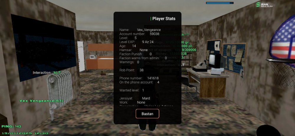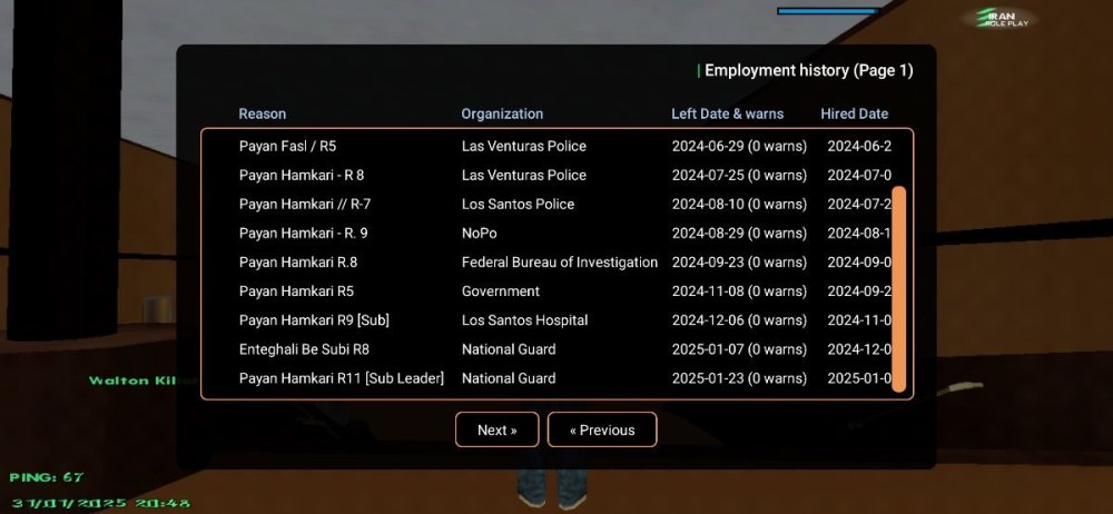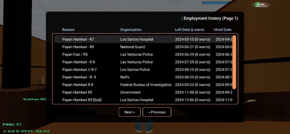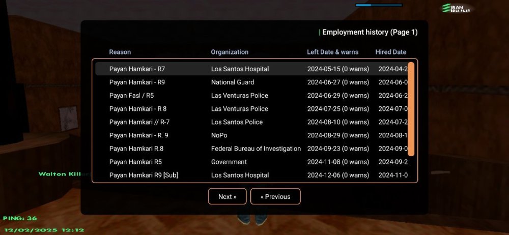 17. IC 1- نام اکانت : Walton_Killer 2- لول : 37 ۳- سن اکانت :53 4- سابقه شما در اقلیت های دولتی (به همراه رنک ها) : LS-MC Payan Hamkari-R7 Army Payan Hamkari-R9 [Top Member] LVPD Payan Fasl R5 LVPD Payan Hamkari-R 8 LSPD Payan Hamkari-R7 NOPO Payan Hamkari-R9 FBI Payan Hamkari-R8[Top Member] Government Payan Hamkari-R5 [LS-MC Payan Hamkari [Sub Army Entgali Be Subi Army Payan Hamkari-[Sub] توجه : عکس از wbook/ و stats اکانت خود را در پیام ارسال فرم آپلود کنید. ( اگر‌ درحال حاضر در سازمانی هستید اسم فکشن و رنکتون هم ارسال کنید ) اطلاعات OOC 1- نام واقعی شما : امیررضا 2- سن واقعی شما : 15 3- آیدی تلگرام : @YeAdameSaket 4 - آیدی دیسکورد : Walton_Killer 5- مقدار تایم پلی روزانه : 5+ 6- هدف شما از لیدری چیست ؟ کسب تجربه تاپ فکشنی 7- اگر لیدر بشید قدرت و وقت کافی برای اداره اقلیت و کنترل بازیکنان داخل اقلیت را دارید ؟ بله 8- چه مقدار ارپی بلدید و چه مقدار به قوانین ارپی مسلط هستید : کامل 9- آیا تا به حال برترین کارمند هفته دولتی بوده‌اید؟ و اگر بوده‌اید تعداد را بنویسید. بله ۲بار Army FBI 10- در چه حد با فروم آشنایی دارید ؟ کامل 11- بر چه اساس عضو خواهید گرفت ؟ معیار شما برای عضوگیری چیست ؟ چه کسانی را وارد تیم میکنید ؟ 1-داشتن سابقه مورد نیاز فکشن 2-داشتن اخلاق و رفتار 3-بلد بودن قوانین سرور و فکشن 12- رقابت برای ورود به فکشن ها بسیار است ، به چه صورتی میتوانید پلیر های بیشتری را جذب کنید ؟ تبلیغات در /Gov برگزاری ایونت‌های جذاب 13- فرض کنید لیدر هستید ، ایده هایی که برای بهبود سازمان ها اجرا خواهید کرد را بصورت کوتاه بیان کنید : ارتقاع سطح آرپی گزاشتم اینوت های جذاب انتخاب ساب و منیجر برای بهبود سازمان 🔸فرم را پر کنید و در همین بخش ارسال نمایید🔸