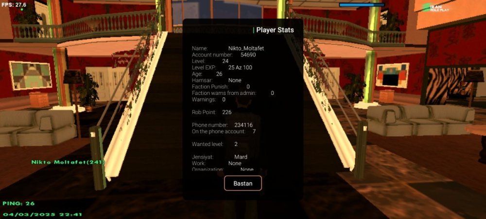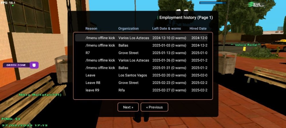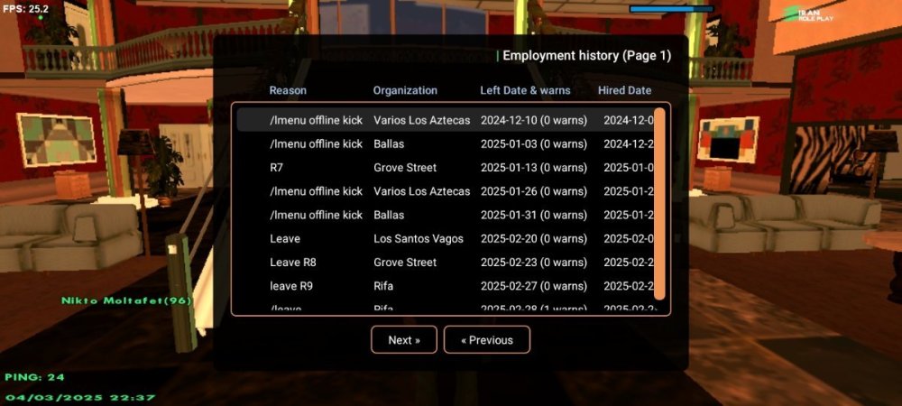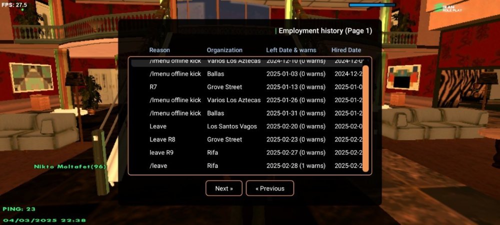 اطلاعات IC 1- نام اکانت :Nikto_Moltafet 2- لول :24 ۳- سن اکانت :26 4- سابقه شما در اقلیت های جنایی (به همراه رنک ها) :Balas// r7 Balas// r7 Vagos //r7 Vagos //r7 Aztecas //r7 Aztecas// r7 Vagos // r6 Grove //r7 Grove// r8 Vagos //r8 Rifa //r9 Rifa// r9 Vagos// r9 Grove // r10 توجه : عکس از wbook/ و stats اکانت خود را در پیام ارسال فرم آپلود کنید. ( اگر درحال حاضر در سازمانی هستید اسم فکشن و رنکتون هم ارسال کنید ) اطلاعات OOC 1- نام واقعی شما :امیر اریان 2- سن واقعی شما :16 3- آیدی تلگرام :@Nikto_Moltafet 4 - آیدی دیسکورد :@Amir_Arian_Moltafet 5- مقدار تایم پلی روزانه :6 7 6- هدف شما از لیدری چیست ؟سابقه لیدری//فول گتو//یک فصل با مقام لیدری در ایران ار پی 7- اگر لیدر بشید قدرت و وقت کافی برای اداره اقلیت و کنترل بازیکنان داخل اقلیت را دارید ؟بله 8- چه مقدار ارپی بلدید و چه مقدار به قوانین ارپی مسلط هستید :کاملا بلدم 9- در چه حد با فروم آشنایی دارید ؟فول 10- بر چه اساس عضو خواهید گرفت ؟ معیار شما برای عضوگیری چیست ؟ چه کسانی را وارد تیم میکنید ؟ایمخوب//داشتن ادب//لول مناسب 11- رقابت برای ورود به فکشن ها بسیار است ، به چه صورتی میتوانید پلیر های بیشتری را جذب کنید ؟pay gang 12- فرض کنید لیدر هستید ، ایده هایی که برای بهبود سازمان ها اجرا خواهید کرد را بصورت کوتاه بیان کنید :pay gang//rob army//rob javaheri//robshop//gerafiti -