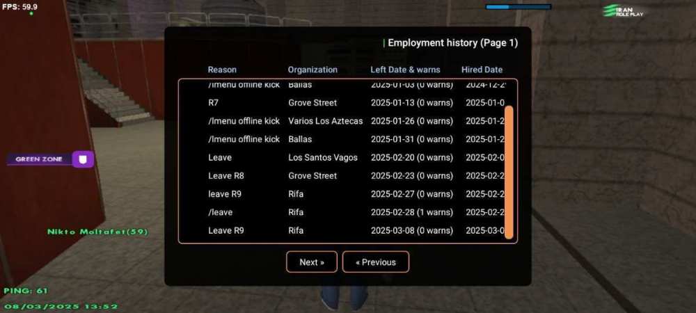1 - نام حساب کاربری شما :Nikto_Moltafet 2 - سطح حساب کاربری شما :24 ۳ - سن شخصیت حساب کاربری شما :27 4 - سوابق خود را در سازمان های جنایی شرح دهید :Balas r7 Balas r7 Aztecas r7 Aztecas r7 grove r7 grove r8 Rifa r9 توجه : عکس از wbook/ و stats/ حساب کاربری خود را حتما در پیام ارسال فرم بارگذاری کنید. اطلاعات OOC 1 - آیدی تلگرام Nikto_Moltafet 2 - آیدی دیسکورد :Nikto_Moltafet 3 - مقدار تایم پلی روزانه :3 4 - در چه حد از رول پلی آگاهی دارید و به قوانین آن مسلط هستید ؟Full 5 - در چه حد با نحوه کارکرد سایت انجمن آشنایی دارید ؟Full