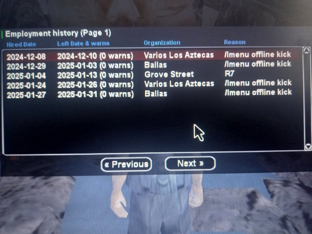 1 - نام حساب کاربری شما :Nikto_Moltafet 2 - سطح حساب کاربری شما :24 ۳ - سن شخصیت حساب کاربری شما :27 4 - سوابق خود را در سازمان های جنایی شرح دهید :Balas r7 Balas r7 Aztecas r7 Aztecas r7 grove r7 grove r8 Rifa r9 توجه : عکس از wbook/ و stats/ حساب کاربری خود را حتما در پیام ارسال فرم بارگذاری کنید. اطلاعات OOC 1 - آیدی تلگرام Nikto_Moltafet 2 - آیدی دیسکورد :Nikto_Moltafet 3 - مقدار تایم پلی روزانه :3 4 - در چه حد از رول پلی آگاهی دارید و به قوانین آن مسلط هستید ؟Full 5 - در چه حد با نحوه کارکرد سایت انجمن آشنایی دارید ؟Full -