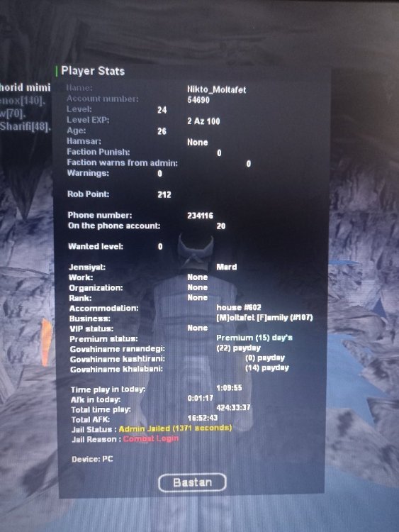 اطلاعات IC 1 - نام حساب کاربری شما :Nikto_Moltafet 2 - سطح حساب کاربری شما :24 ۳ - سن شخصیت حساب کاربری شما :27 4 - سوابق خود را در سازمان های جنایی شرح دهید :Balas r7 balas r7 Aztecas r7 Aztecas r7 vagos r7 Grove r7 grovr r8 Rifa r7 Rifa r9 Rifa r9 Grove L r10 توجه : عکس از wbook/ و stats/ حساب کاربری خود را حتما در پیام ارسال فرم بارگذاری کنید. اطلاعات OOC 1 - آیدی تلگرام :@Nikto_Moltafet 2 - آیدی دیسکورد @ Nikto_Moltafet 3 - مقدار تایم پلی روزانه : 4 - در چه حد از رول پلی آگاهی دارید و به قوانین آن مسلط هستید ؟Full 5 - در چه حد با نحوه کارکرد سایت انجمن آشنایی آشنایی دارید؟ Full -