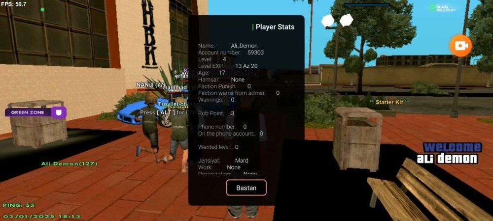 2. IC 1 - نام حساب کاربری شما : Ali_Demon 2 - سطح حساب کاربری شما : 5 ۳ - سن شخصیت حساب کاربری شما : 18 4 - سوابق خود را در سازمان های جنایی شرح دهید : ndarm توجه : عکس از wbook/ و stats/ حساب کاربری خود را حتما در پیام ارسال فرم بارگذاری کنید. اطلاعات OOC 1 - آیدی تلگرام : @Alireza1_Rail 2 - آیدی دیسکورد :ndarm 3 - مقدار تایم پلی روزانه : 5 4 - در چه حد از رول پلی آگاهی دارید و به قوانین آن مسلط هستید ؟ کاملاً 5 - در چه حد با نحوه کارکرد سایت انجمن آشنایی دارید ؟ کاملاً