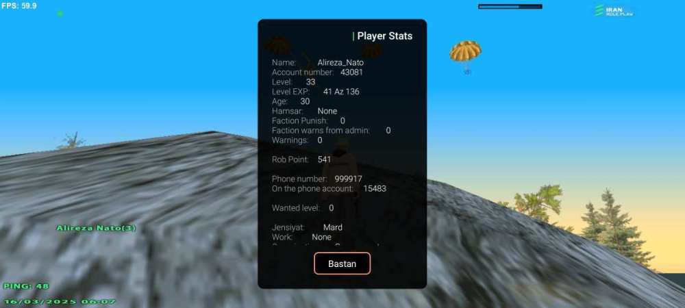 نام شما در بازی:Alireza_Nato نام پلیری که شما از ایشان شکایت دارید: اطلاعات اکانت شما (Level، رنک و فکشن فعلی شما در سرور) : لول ۳۳ فکشن گاورمنت توضیحات شکایت: OSK مدارک مورد نیاز از (فیلم،عکس‌و...)