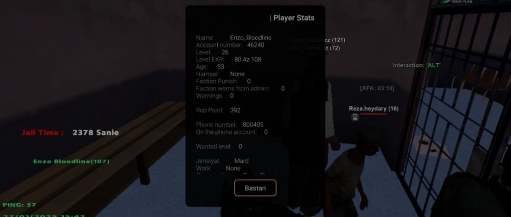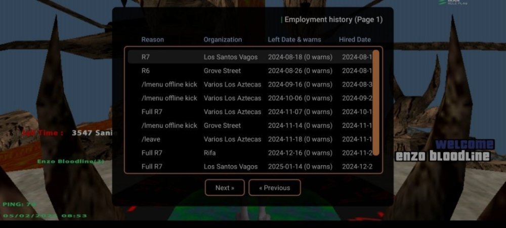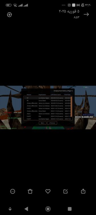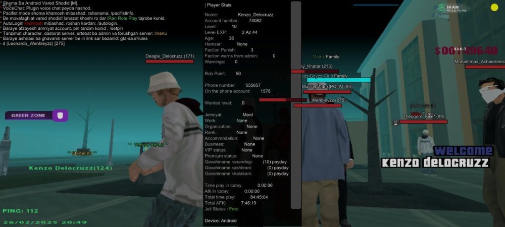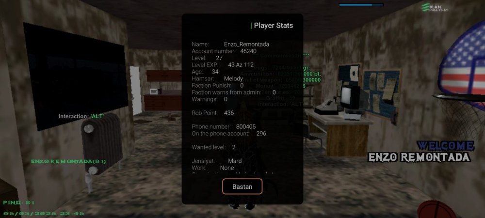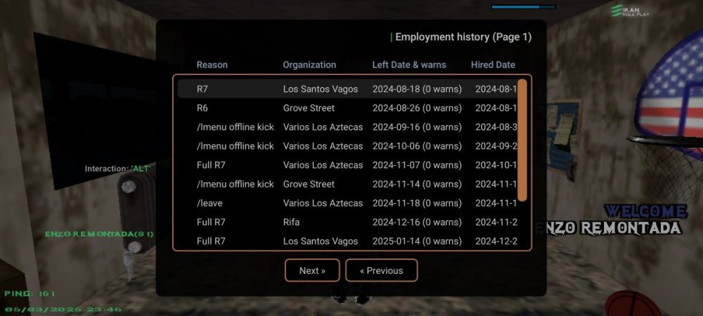 1. نام اکانت :Enzo_Bladeyzz 2- لول :26 ۳- سن اکانت :33 4- سابقه شما در اقلیت های جنایی (به همراه رنک ها) :Vagos r7 Grov r6 Aztecas r7 Aztecas r6 Aztecas full r7 Grovv full r7 Rifa full r7 Vagoss full r7 Grovv full r 7 Vagod demote leader r6 توجه : عکس از wbook/ و stats اکانت خود را در پیام ارسال فرم آپلود کنید. ( اگر‌ درحال حاضر در سازمانی هستید اسم فکشن و رنکتون هم ارسال کنید ) اطلاعات OOC 1- نام واقعی شما :کسری 2- سن واقعی شما :۱۵ 3- آیدی تلگرام :@Tezariuu 4 - آیدی دیسکورد :Kasra07956 5- مقدار تایم پلی روزانه :۲ 6- هدف شما از لیدری چیست ؟فولی 7- اگر لیدر بشید قدرت و وقت کافی برای اداره اقلیت و کنترل بازیکنان داخل اقلیت را دارید ؟بله 8- چه مقدار ارپی بلدید و چه مقدار به قوانین ارپی مسلط هستید :فول 9- در چه حد با فروم آشنایی دارید ؟ 10- بر چه اساس عضو خواهید گرفت ؟ معیار شما برای عضوگیری چیست ؟ چه کسانی را وارد تیم میکنید ؟لپل ۴ به بالا ایم خوب 11- رقابت برای ورود به فکشن ها بسیار است ، به چه صورتی میتوانید پلیر های بیشتری را جذب کنید ؟متینگ جوایز نفیس 12- فرض کنید لیدر هستید ، ایده هایی که برای بهبود سازمان ها اجرا خواهید کرد را بصورت کوتاه بیان کنید :پول گیم به تاپ ممبر راب 🔸فرم را پر کنید و در همین بخش ارسال نمایید🔸