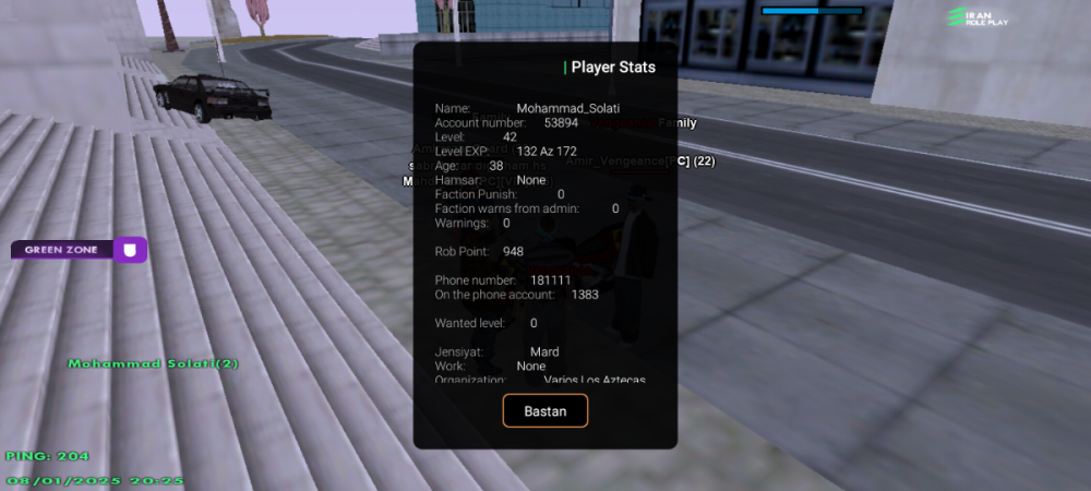 5. -نام حساب کاربری شما : Mohammad_Solati 2 - سطح حساب کاربری شما : 42 ۳ - سن شخصیت حساب کاربری شما : 38 4 - سوابق خود را در سازمان های جنایی شرح دهید : نبودم توجه : عکس از wbook/ و stats/ حساب کاربری خود را حتما در پیام ارسال فرم بارگذاری کنید. اطلاعات OOC 1 - آیدی تلگرام : Mohemmad3 2 - آیدی دیسکورد : mohamad_nova 3 - مقدار تایم پلی روزانه :+4 4 - در چه حد از رول پلی آگاهی دارید و به قوانین آن مسلط هستید ؟ کامل 5 - در چه حد با نحوه کارکرد سایت انجمن آشنایی دارید ؟ کامل