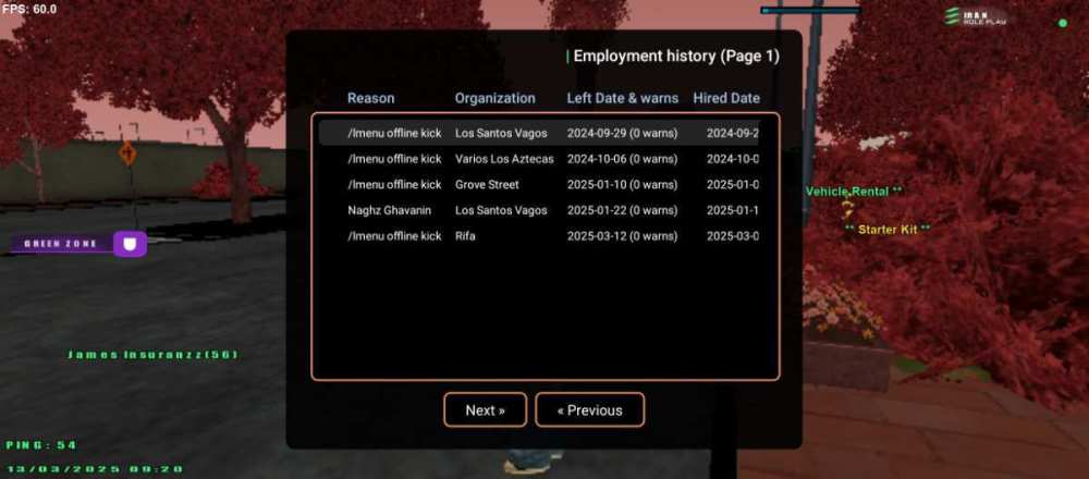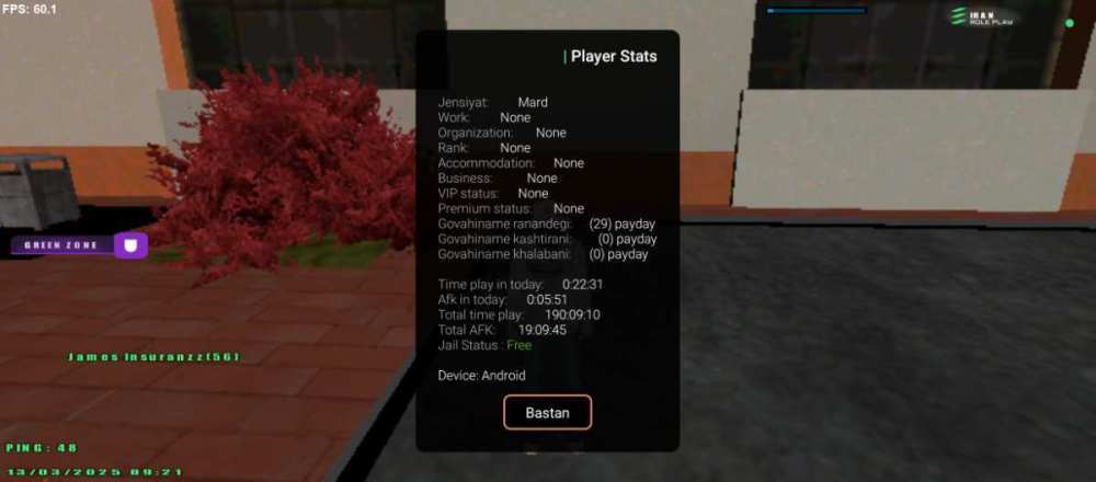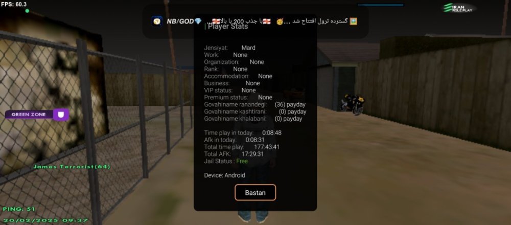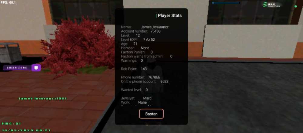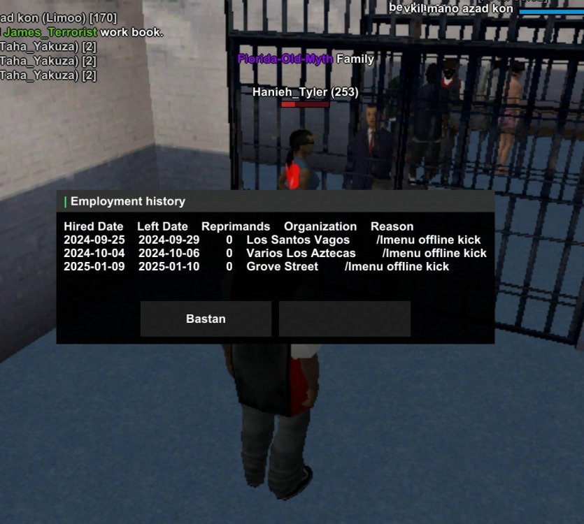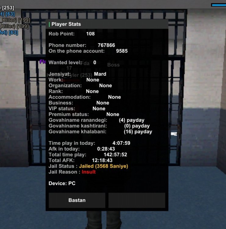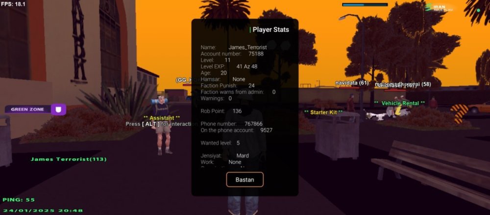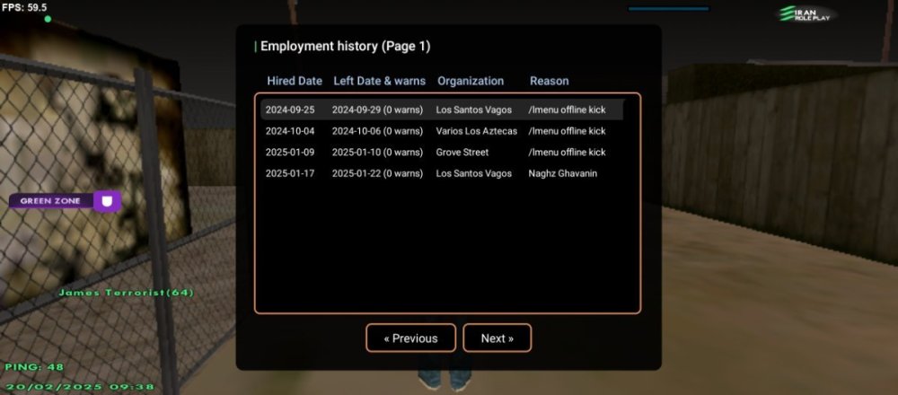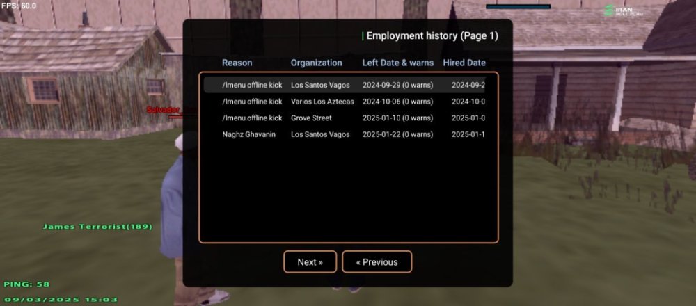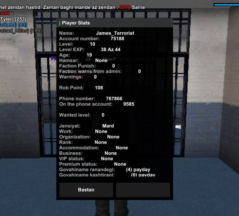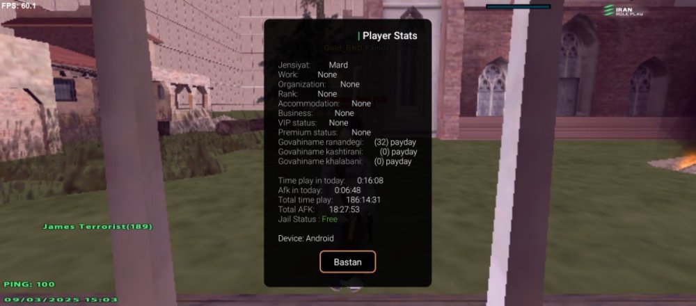 6. اطلاعات IC 1 - نام حساب کاربری شما :James_Terrorist 2 - سطح حساب کاربری شما :10 ۳ - سن شخصیت حساب کاربری شما 19: 4 - سوابق خود را در سازمان های جنایی شرح دهید :عکس وی بوک توجه : عکس از wbook/ و stats/ حساب کاربری خود را حتما در پیام ارسال فرم بارگذاری کنید. اطلاعات OOC 1 - آیدی تلگرام :James_Terrorist 2 - آیدی دیسکورد :ندارم 3 - مقدار تایم پلی روزانه :+5 4 - در چه حد از رول پلی آگاهی دارید و به قوانین آن مسلط هستید ؟کامل 5 - در چه حد با نحوه کارکرد سایت انجمن آشنایی دارید ؟کامل