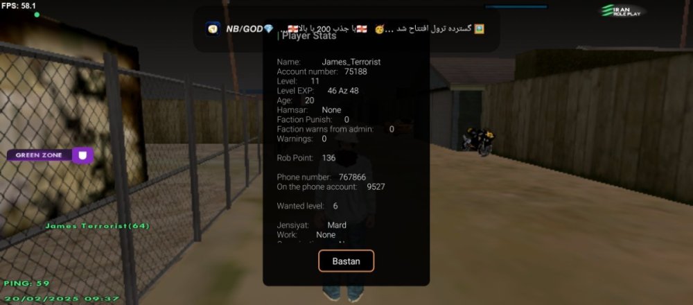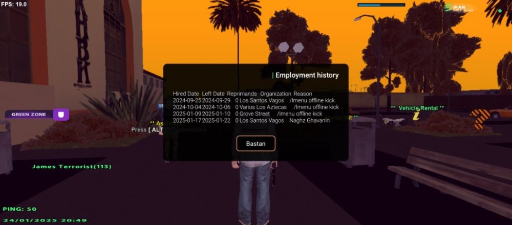 4. اطلاعات IC 1 - نام حساب کاربری شما :James_Terrorist 2 - سطح حساب کاربری شما :11 ۳ - سن شخصیت حساب کاربری شما :20 4 - سوابق خود را در سازمان های جنایی شرح دهید : grov r6 vagos r6 توجه : عکس از wbook/ و stats/ حساب کاربری خود را حتما در پیام ارسال فرم بارگذاری کنید. اطلاعات OOC 1 - آیدی تلگرام :Batman_Terrorist 2 - آیدی دیسکورد :ندارم 3 - مقدار تایم پلی روزانه :+3 4 - در چه حد از رول پلی آگاهی دارید و به قوانین آن مسلط هستید ؟کامل 5 - در چه حد با نحوه کارکرد سایت انجمن آشنایی دارید ؟کامل