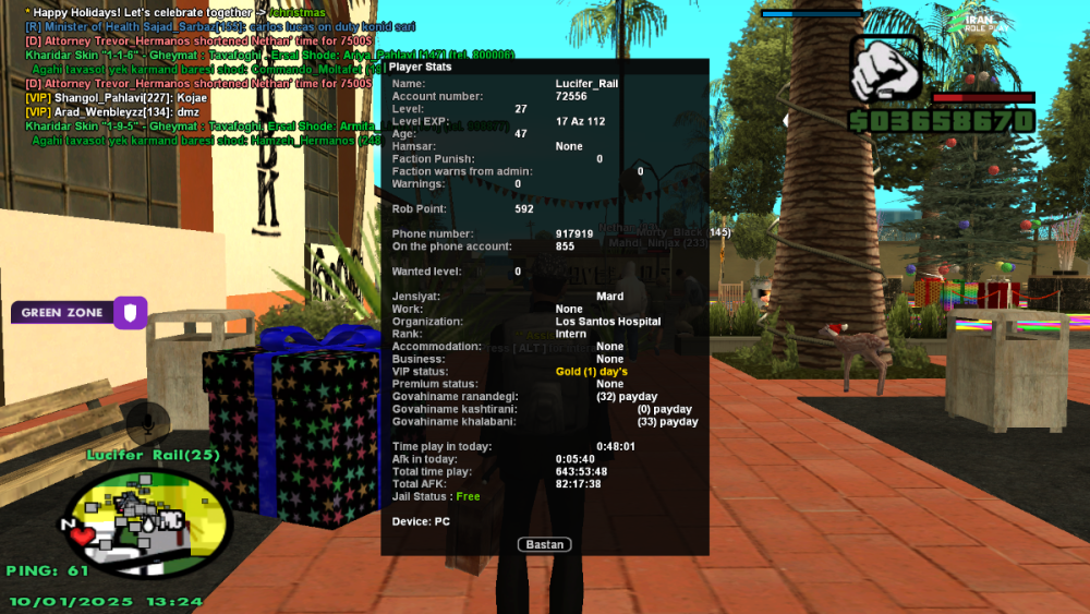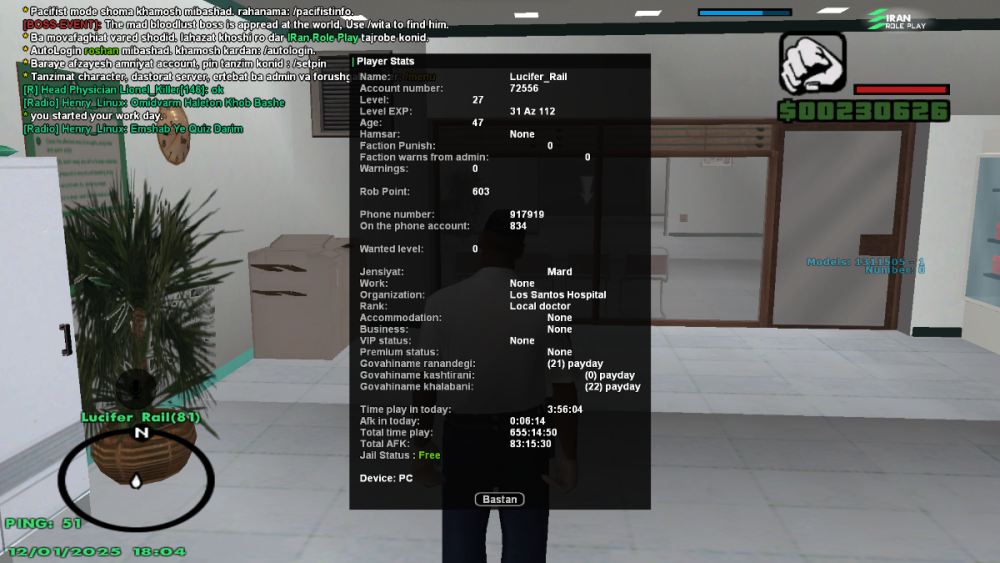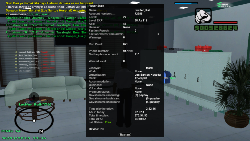 اطلاعات اکانت شما (Level، رنک و فکشن فعلی شما در سرور): لول 27 , فکشن LS medic R3