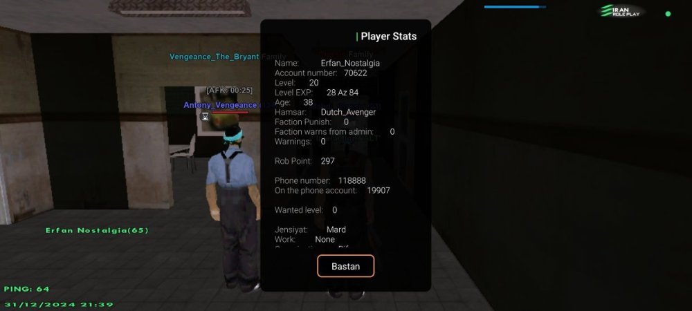 1 - نام حساب کاربری شما : Erfan_Blockboyzz 2 - سطح حساب کاربری شما :21 ۳ - سن شخصیت حساب کاربری شما :39 4 - سوابق خود را در سازمان های جنایی شرح دهید : بالاس گروو ازتکس توجه : عکس از wbook/ و stats/ حساب کاربری خود را حتما در پیام ارسال فرم بارگذاری کنید. اطلاعات OOC 1 - آیدی تلگرام :@Erfan_Nostal 2 - آیدی دیسکورد : erfan04003 3 - مقدار تایم پلی روزانه :4.5 4 - در چه حد از رول پلی آگاهی دارید و به قوانین آن مسلط هستید ؟کامل 5 - در چه حد با نحوه کارکرد سایت انجمن آشنایی دارید ؟کامل -
