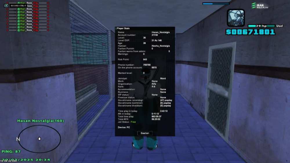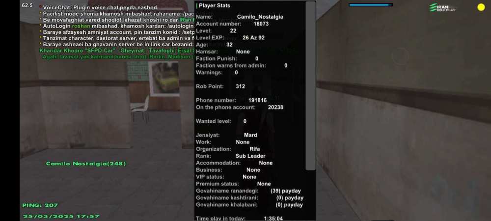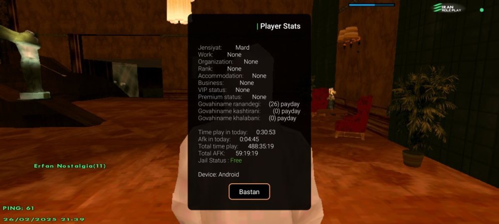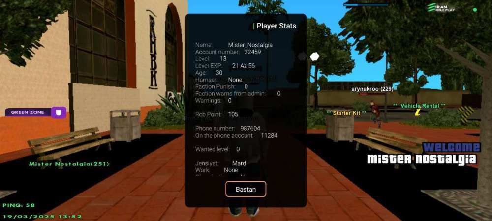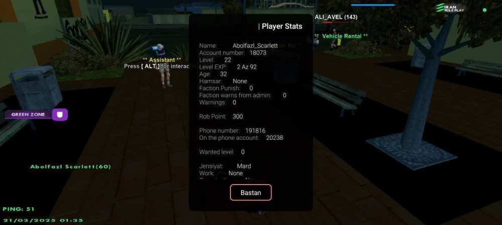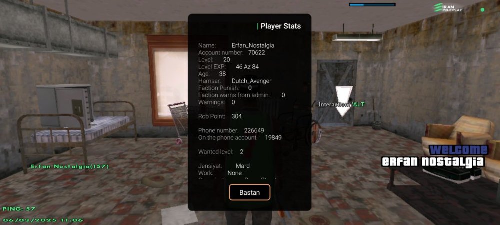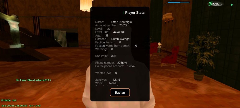 1 - نام حساب کاربری شما : Hasan_Nostalgia 2 - سطح حساب کاربری شما :36 ۳ - سن شخصیت حساب کاربری شما :39 4 - سوابق خود را در سازمان های جنایی شرح دهید : بالاس گروو ازتکس توجه : عکس از wbook/ و stats/ حساب کاربری خود را حتما در پیام ارسال فرم بارگذاری کنید. اطلاعات OOC 1 - آیدی تلگرام :amin70708 2 - آیدی دیسکورد :erfan04039 3 - مقدار تایم پلی روزانه :4.5 4 - در چه حد از رول پلی آگاهی دارید و به قوانین آن مسلط هستید ؟کامل 5 - در چه حد با نحوه کارکرد سایت انجمن آشنایی دارید ؟کامل -