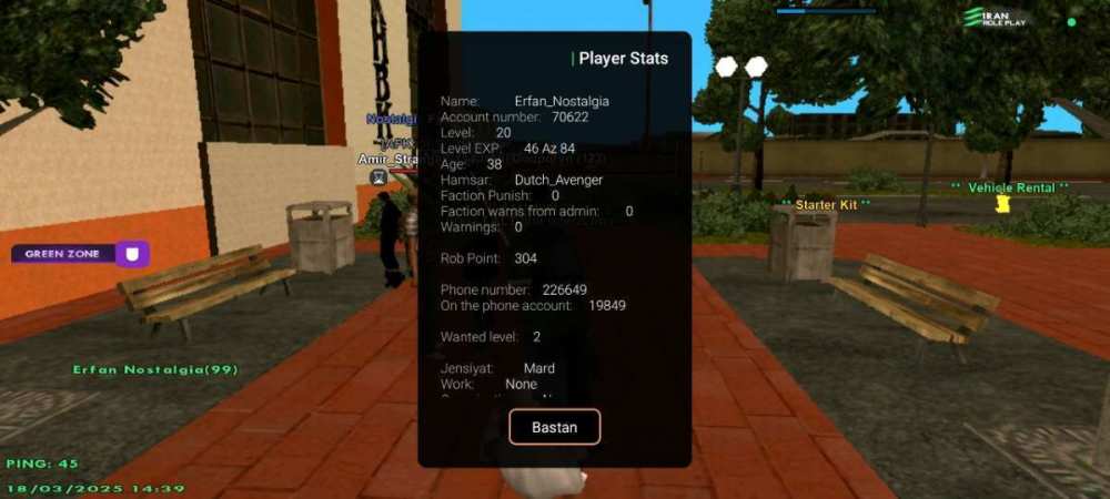 1 - نام حساب کاربری شما : Erfan_Nostalgia 2 - سطح حساب کاربری شما :20 ۳ - سن شخصیت حساب کاربری شما :20 4 - سوابق خود را در سازمان های جنایی شرح دهید : بالاس گروو ازتکس توجه : عکس از wbook/ و stats/ حساب کاربری خود را حتما در پیام ارسال فرم بارگذاری کنید. اطلاعات OOC 1 - آیدی تلگرام :Erfan_Nostal 2 - آیدی دیسکورد :erfan04039 3 - مقدار تایم پلی روزانه :4.5 4 - در چه حد از رول پلی آگاهی دارید و به قوانین آن مسلط هستید ؟کامل 5 - در چه حد با نحوه کارکرد سایت انجمن آشنایی دارید ؟کامل -