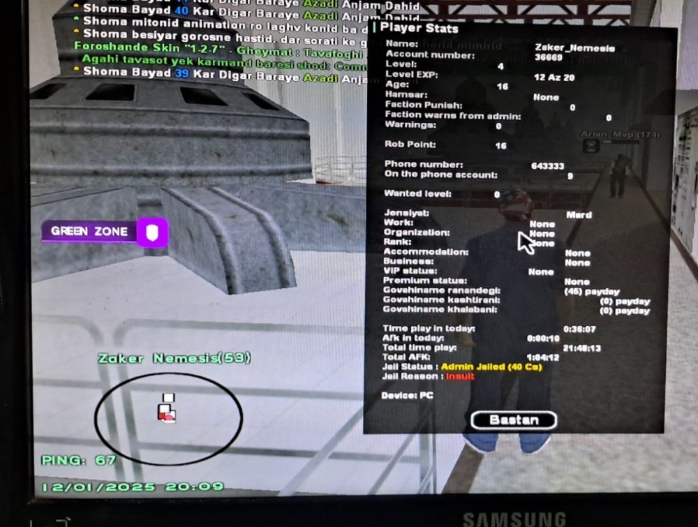 نام شما در بازی: Zaker_Nemesis نام پلیری که شما از ایشان شکایت دارید: Arian_Mvp اطلاعات اکانت شما (Level، رنک و فکشن فعلی شما در سرور): لول ۴ هیچ فکشنی حضور ندارم توضیحات شکایت: با سلام ایشون از جیل آزاد شد و من رفتم بالا سرش بعد بهم توهین کرد مدارک مورد نیاز (فیلم،عکسو...)