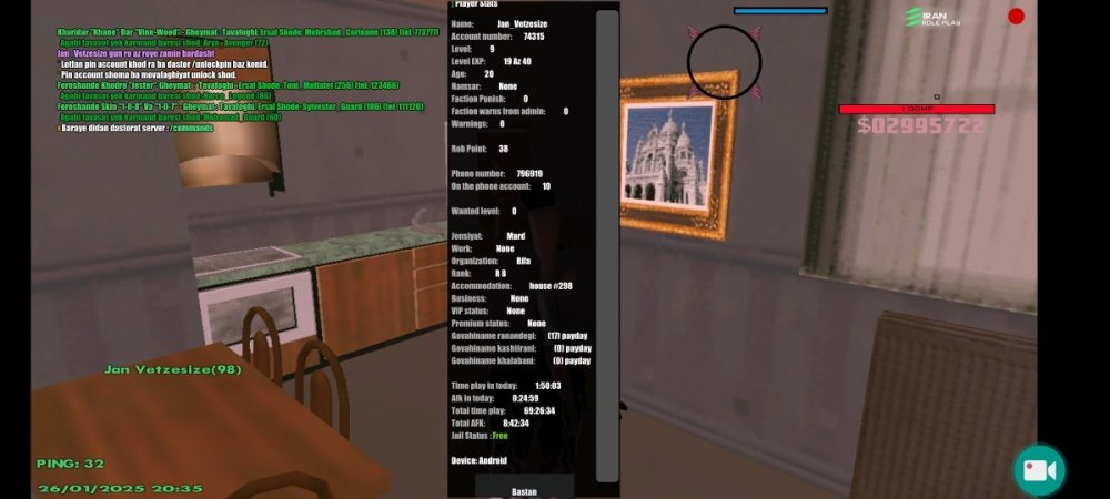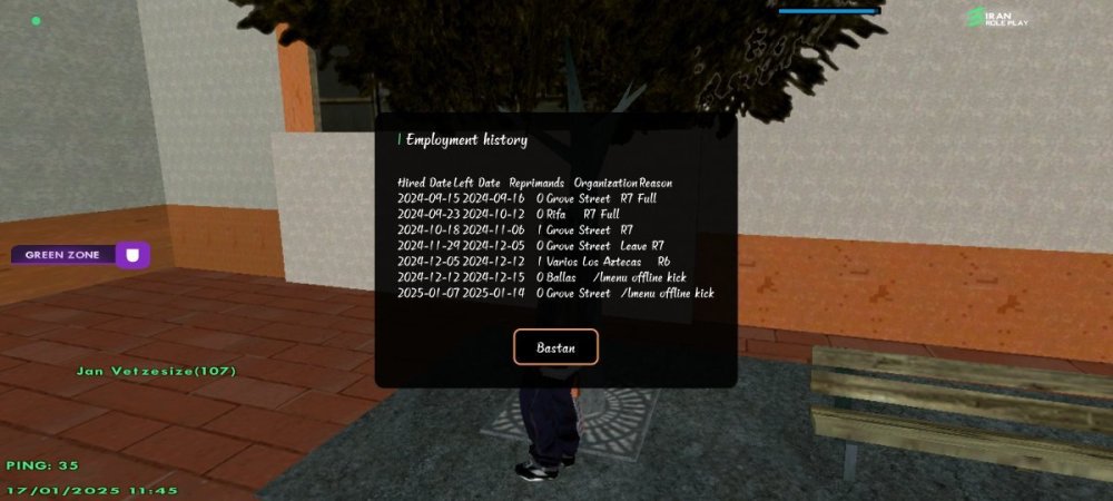 اطلاعات IC 1 - نام حساب کاربری شما :Jan_Vetzesize 2 - سطح حساب کاربری شما :8 ۳ - سن شخصیت حساب کاربری شما :22 4 - سوابق خود را در سازمان های جنایی شرح دهید : Grove r7 full Rifa R7 Full Grove R7 Grove r7 leave Aztecs r6 Balas r7 offline kick توجه : عکس از wbook/ و stats/ حساب کاربری خود را حتما در پیام ارسال فرم بارگذاری کنید. اطلاعات OOC 1 - آیدی تلگرام :@Qollye 2 - آیدی دیسکورد :ندارم 3 - مقدار تایم پلی روزانه :+۲ 4 - در چه حد از رول پلی آگاهی دارید و به قوانین آن مسلط هستید ؟کاملا 5 - در چه حد با نحوه کارکرد سای ت انجمن آشنایی دارید ؟کاملا
