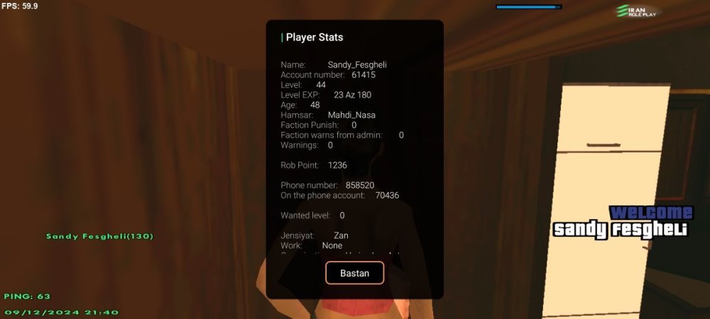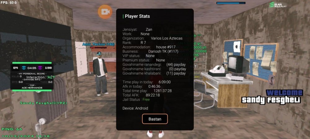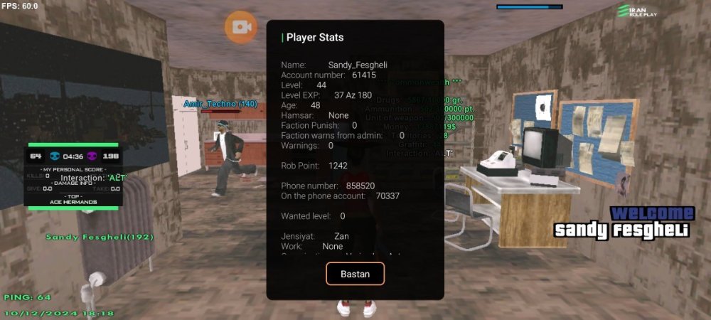 اطلاعات اکانت شما (Level، رنک و فکشن فعلی شما در سرور):Level 43 Vagos R7