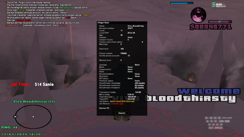 نام شما در بازی: Jeri_Belandorezz نام پلیری که شما از ایشان شکایت دارید: اطلاعات اکانت شما (Level، رنک و فکشن فعلی شما در سرور): لول 6 رنک 7 واگوس توضیحات شکایت: طبق قوانین پایه رولپلی بخش 2 بند 1 : صدمه و آسیب رساندن به شخص یا اموال او بدون دلیل و مدرک کافی و قانع کننده IC ممنوع است. یکی از پلیران سازمان جنایی واگوس در انجا حضور داشته و شاهد این اتفاقات میباشد مدارک مورد نیاز (فیلم،عکس‌و...)