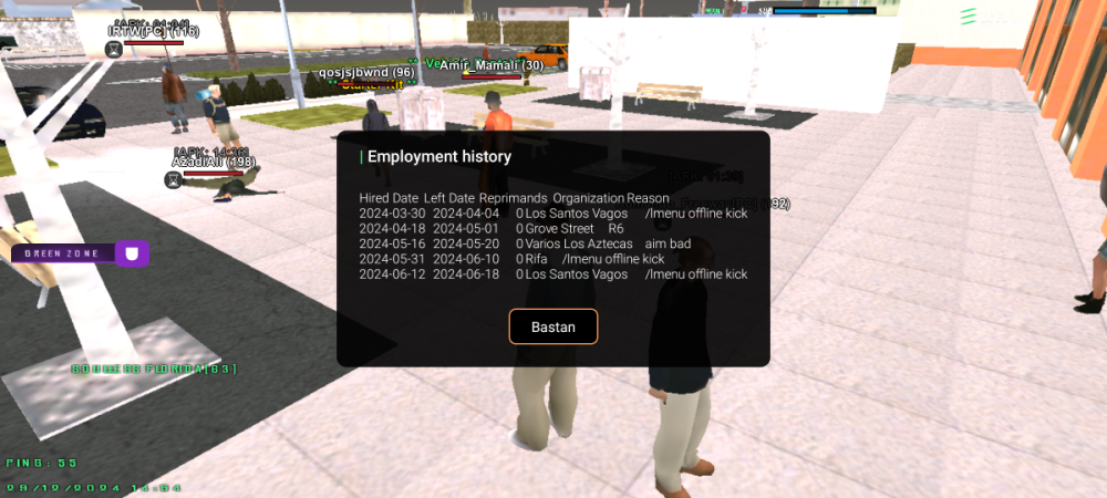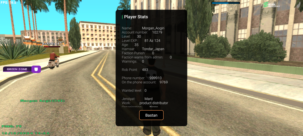 4. اطلاعات IC 1 - نام حساب کاربری شما : Moscow_Bloodline 2 - سطح حساب کاربری شما : 16 ۳ - سن شخصیت حساب کاربری شما : 32 4 - سوابق خود را در سازمان های جنایی شرح دهید : Grove Rifa Grove Aztec توجه : عکس از wbook/ و stats/ حساب کاربری خود را حتما در پیام ارسال فرم بارگذاری کنید. اطلاعات OOC 1 - آیدی تلگرام : @itzalizz 2 - آیدی دیسکورد : @niggabashi 3 - مقدار تایم پلی روزانه :+2 4 - در چه حد از رول پلی آگاهی دارید و به قوانین آن مسلط هستید ؟ کاملاً 5 - در چه حد با نحوه کارکرد سایت انجمن آشنایی دارید ؟مسلطم