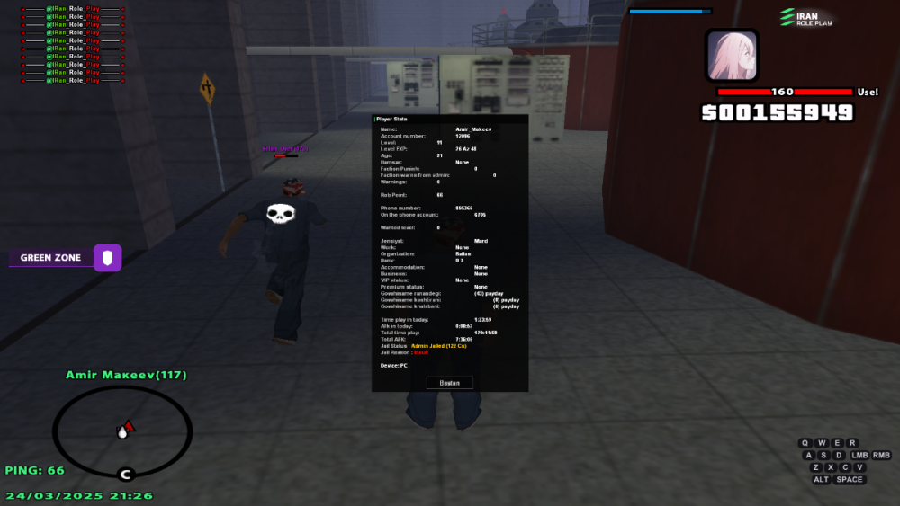 2. 1 - نام حساب کاربری شما : Amirali_Onepiece 2 - سطح حساب کاربری شما : 6 ۳ - سن شخصیت حساب کاربری شما : 18 4 - سوابق خود را در سازمان های جنایی شرح دهید : Ballas Rifa Grove Aztecas Vagos توجه : عکس از wbook/ و stats/ حساب کاربری خود را حتما در پیام ارسال فرم بارگذاری کنید. اطلاعات OOC 1 - آیدی تلگرام : FranticQ@ 2 - آیدی دیسکورد :- 3 - مقدار تایم پلی روزانه : +3 4 - در چه حد از رول پلی آگاهی دارید و به قوانین آن مسلط هستید ؟ بله 5 - در چه حد با نحوه کارکرد سایت انجمن آشنایی دارید ؟ کامل