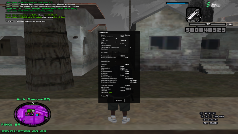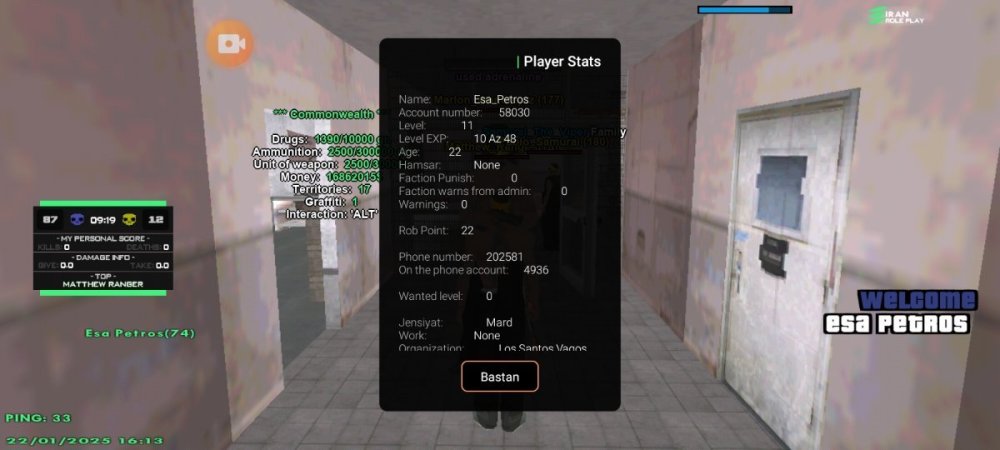 11. 1 - نام حساب کاربری شما : Amir_Makeev 2 - سطح حساب کاربری شما : 11 ۳ - سن شخصیت حساب کاربری شما : 21 4 - سوابق خود را در سازمان های جنایی شرح دهید : vagos rifa aztecas grove ballas توجه : عکس از wbook/ و stats/ حساب کاربری خود را حتما در پیام ارسال فرم بارگذاری کنید. اطلاعات OOC 1 - آیدی تلگرام : @Franticq 2 - آیدی دیسکورد : - 3 - مقدار تایم پلی روزانه : +3 4 - در چه حد از رول پلی آگاهی دارید و به قوانین آن مسلط هستید ؟ بله 5 - در چه حد با نحوه کارکرد سایت انجمن آشنایی دارید ؟ کامل