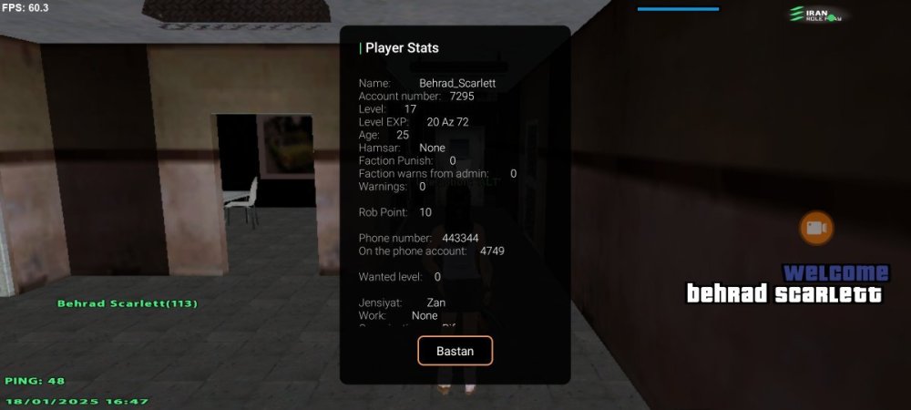25. اطلاعات IC 1 - نام حساب کاربری شما:Behrad_Terrorist 2 - سطح حساب کاربری شما :25 ۳ - سن شخصیت حساب کاربری شما :35 4 - سوابق خود را در سازمان های جنایی شرح دهید : B r6 B off kick A r7 G r7 G off kick A r7 G leave B off kick R off kick توجه : عکس از wbook/ و stats/ حساب کاربری خود را حتما در پیام ارسال فرم بارگذاری کنید. اطلاعات OOC 1 - آیدی تلگرام :Rip_jj 2 - آیدی دیسکورد :behrad_hermanos 3 - مقدار تایم پلی روزانه : +2 4 - در چه حد از رول پلی آگاهی دارید و به قوانین آن مسلط هستید ؟ Full 5 - در چه حد با نحوه کارکرد سایت انجمن آشنایی دارید ؟ Full