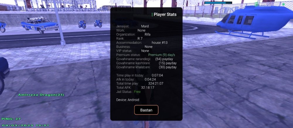 4. اطلاعات IC 1 - نام حساب کاربری شما : Amirreza_Dragon 2 - سطح حساب کاربری شما : 15 ۳ - سن شخصیت حساب کاربری شما :28 4 - سوابق خود را در سازمان های جنایی شرح دهید : Vagos R6 Vagos R6 Rifa R7/پایان خدمت Grove street R7/پایان خدمت Balas R7/ پایان همکاری توجه : عکس از wbook/ و stats/ حساب کاربری خود را حتما در پیام ارسال فرم بارگذاری کنید. اطلاعات OOC 1 - آیدی تلگرام : @amirreza_dragon 2 - آیدی دیسکورد : . 3 - مقدار تایم پلی روزانه : 3 4 - در چه حد از رول پلی آگاهی دارید و به قوانین آن مسلط هستید ؟ کامل 5 - در چه حد با نحوه کارکرد سای ت انجمن آشنایی دارید ؟ کامل