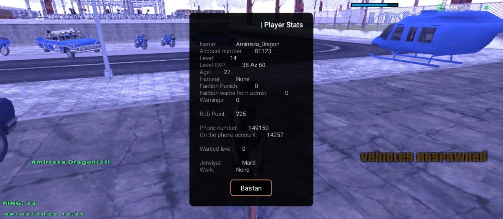 8. - نام حساب کاربری شما : Amirreza_Dragon 2 - سطح حساب کاربری شما : 15 ۳ - سن شخصیت حساب کاربری شما :18 4 - سوابق خود را در سازمان های جنایی شرح دهید : vagos Vagos Rifa توجه : عکس از wbook/ و stats/ حساب کاربری خود را حتما در پیام ارسال فرم بارگذاری کنید. اطلاعات OOC 1 - آیدی تلگرام : @amirreza_dragon 2 - آیدی دیسکورد : . 3 - مقدار تایم پلی روزانه : 3 4 - در چه حد از رول پلی آگاهی دارید و به قوانین آن مسلط هستید ؟ کامل 5 - در چه حد با نحوه کارکرد سایت انجمن آشنایی دارید ؟ کامل