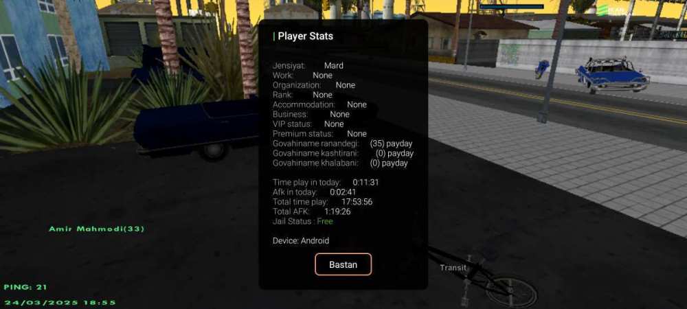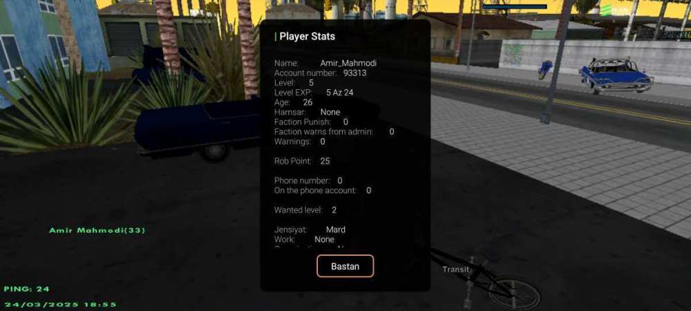 1 - نام حساب کاربری شما :Amir_Mahmodi 2 - سطح حساب کاربری شما :4 ۳ - سن شخصیت حساب کاربری شما :25 4 - سوابق خود را در سازمان های جنایی شرح دهید :ندارم توجه : عکس از wbook/ و stats/ حساب کاربری خود را حتما در پیام ارسال فرم بارگذاری کنید. اطلاعات OOC 1 - آیدی تلگرام :Amir_Mmddl 2 - آیدی دیسکورد :ندارم 3 - مقدار تایم پلی روزانه :+2 4 - در چه حد از رول پلی آگاهی دارید و به قوانین آن مسلط هستید ؟کامل 5 - در چه حد با نحوه کارکرد سایت انجمن آشنایی دارید ؟ کامل