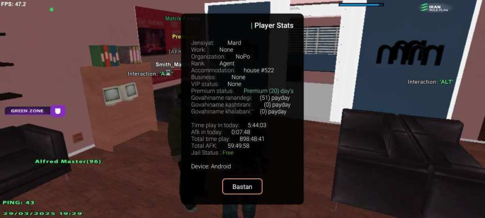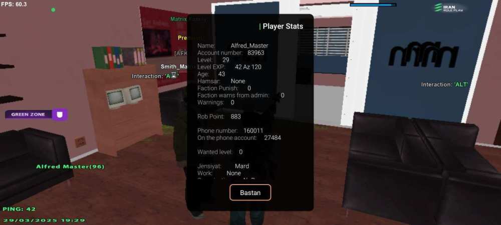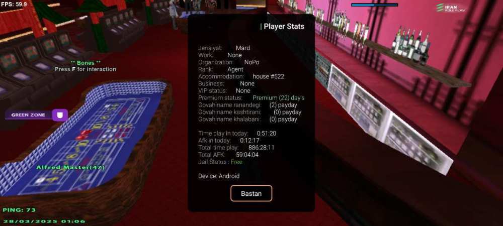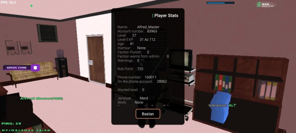 2. اطلاعات IC 1 - نام حساب کاربری شما : Alfred_Nexus 2 - سطح حساب کاربری شما : 10 ۳ - سن شخصیت حساب کاربری شما : 23 4 - سابقه شما در سازمان های دولتی (به همراه رنک ها) : ندارم توجه : عکس از wbook/ و stats/ حساب کاربری خود را حتما در پیام ارسال فرم بارگذاری کنید. اطلاعات OOC 1 - آیدی تلگرام : y_adam_tanha@ 2 - مقدار تایم پلی روزانه : +4 3 - در چه حد از رول پلی آگاهی دارید و به قوانین آن مسلط هستید ؟ کامل 4 - آیا تا به حال برترین کارمند هفته دولتی بوده‌اید؟ اگر بله تعداد را بنویسید : خیر 5 - در چه حد با نحوه کارکرد سایت انجمن آشنایی دارید ؟ کامل