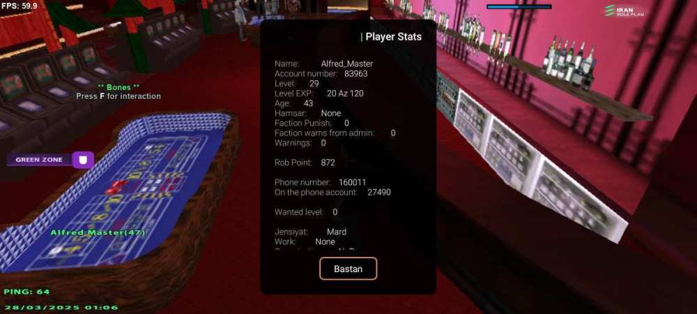 1. اطلاعات IC 1 - نام حساب کاربری شما : Lionel_Emerald 2 - سطح حساب کاربری شما : 33 ۳ - سن شخصیت حساب کاربری شما : 47 4 - سابقه شما در سازمان های دولتی (به همراه رنک ها) : Army R7 Medic R7 Payan News R7 Payan Lspd : Abuse Faction Lspd R7 Payan Nopo R10 Payam Fbi R8 Payan Government : Offline kick Government : Offline kick توجه : عکس از wbook/ و stats/ حساب کاربری خود را حتما در پیام ارسال فرم بارگذاری کنید. اطلاعات OOC 1 - آیدی تلگرام : y_adam_tanha@ 2 - مقدار تایم پلی روزانه : +6 3 - در چه حد از رول پلی آگاهی دارید و به قوانین آن مسلط هستید ؟ کامل 4 - آیا تا به حال برترین کارمند هفته دولتی بوده‌اید؟ اگر بله تعداد را بنویسید : خیر 5 - در چه حد با نحوه کارکرد سای ت انجمن آشنایی دارید ؟ کامل