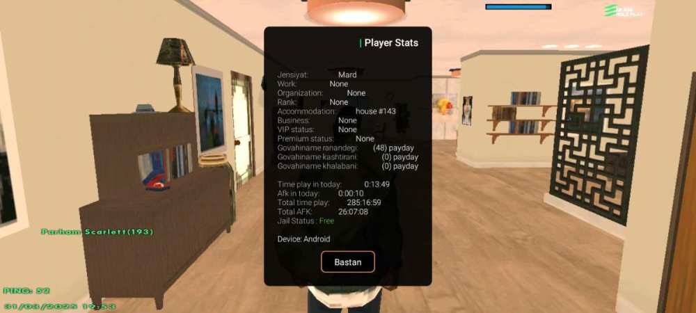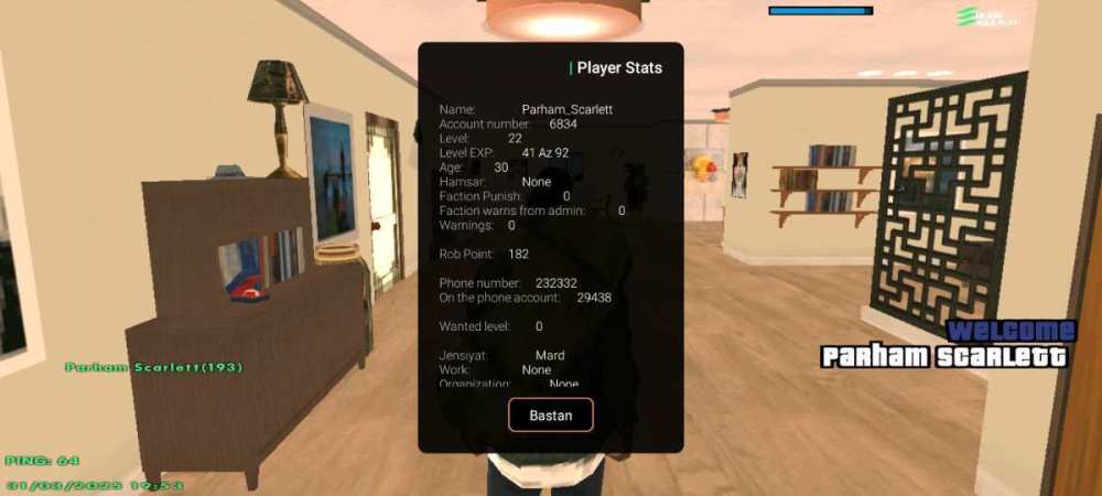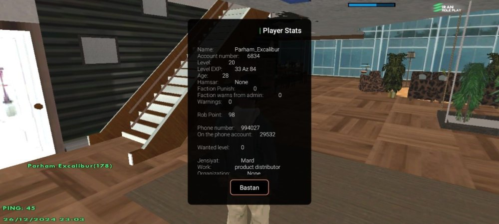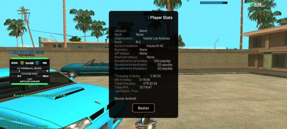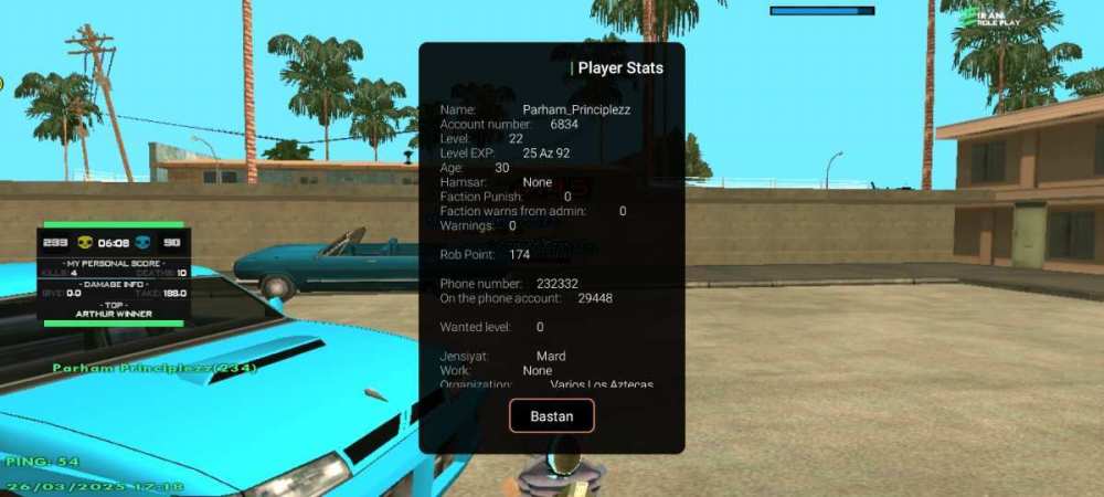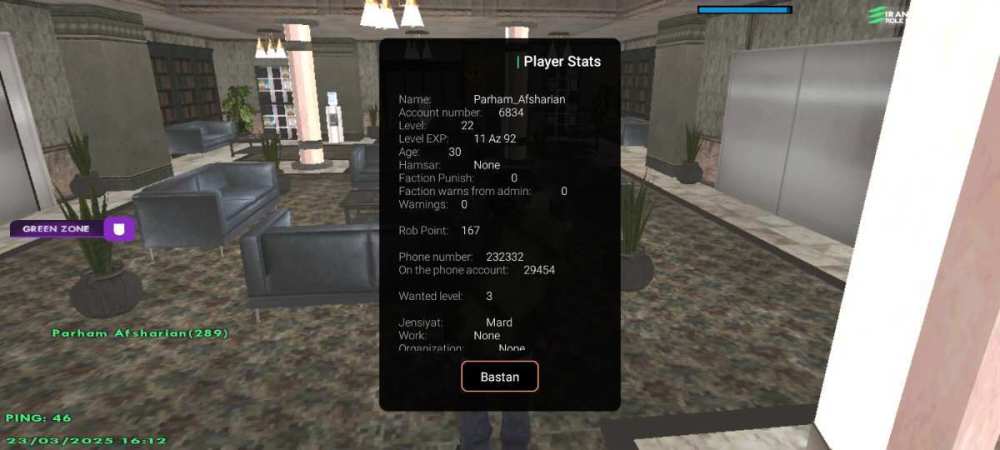 اطلاعات اکانت شما (Level، رنک و فکشن فعلی شما در سرور): لول ۲۶ سن شخصیت توی بازی ۳۴