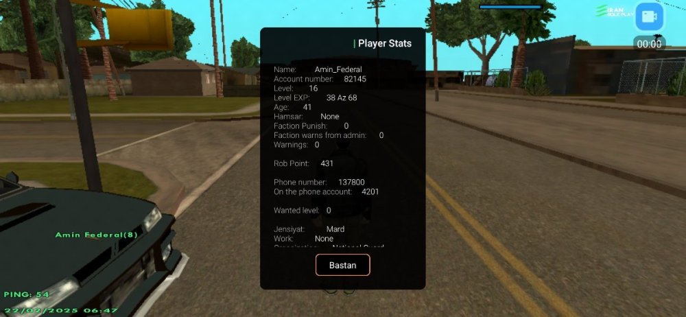 11. IC 1 - نام حساب کاربری شما :Shahan_Federal 2 - سطح حساب کاربری شما :4 ۳ - سن شخصیت حساب کاربری شما :30 4 - سوابق خود را در سازمان های جنایی شرح دهید :ندارم توجه : عکس از wbook/ و stats/ حساب کاربری خود را حتما در پیام ارسال فرم بارگذاری کنید. اطلاعات OOC 1 - آیدی تلگرام :amin_fbi1 2 - آیدی دیسکورد :amin_cia 3 - مقدار تایم پلی روزانه :5 4 - در چه حد از رول پلی آگاهی دارید و به قوانین آن مسلط هستید ؟کامل