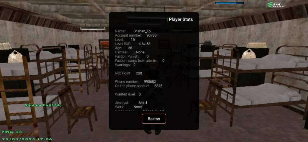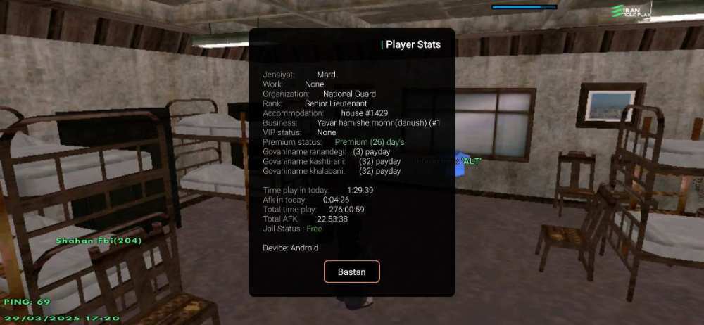 10. IC 1 - نام حساب کاربری شما :Shahan_Federal 2 - سطح حساب کاربری شما :4 ۳ - سن شخصیت حساب کاربری شما :30 4 - سوابق خود را در سازمان های جنایی شرح دهید :ندارم توجه : عکس از wbook/ و stats/ حساب کاربری خود را حتما در پیام ارسال فرم بارگذاری کنید. اطلاعات OOC 1 - آیدی تلگرام :amin_fbi1 2 - آیدی دیسکورد :amin_cia 3 - مقدار تایم پلی روزانه :5 4 - در چه حد از رول پلی آگاهی دارید و به قوانین آن مسلط هستید ؟کامل