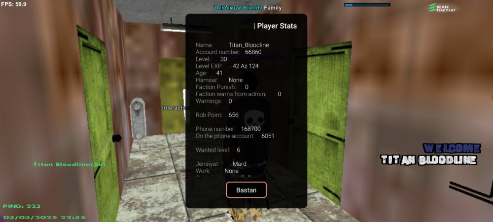 18. 1 - نام حساب کاربری شما : Titan_Bloodline 2 - سطح حساب کاربری شما :29 ۳ - سن شخصیت حساب کاربری شما :17 4 - سوابق خود را در سازمان های جنایی شرح دهید : توجه : عکس از wbook/ و stats/ حساب کاربری خود را حتما در پیام ارسال فرم بارگذاری کنید. اطلاعات OOC 1 - آیدی تلگرام :@DerHoseiN 2 - آیدی دیسکورد : ندارم 3 - مقدار تایم پلی روزانه :۳ 4 - در چه حد از رول پلی آگاهی دارید و به قوانین آن مسلط هستید ؟فول 5 - در چه حد با نحوه کارکرد سایت انجمن آشنایی دارید ؟فول