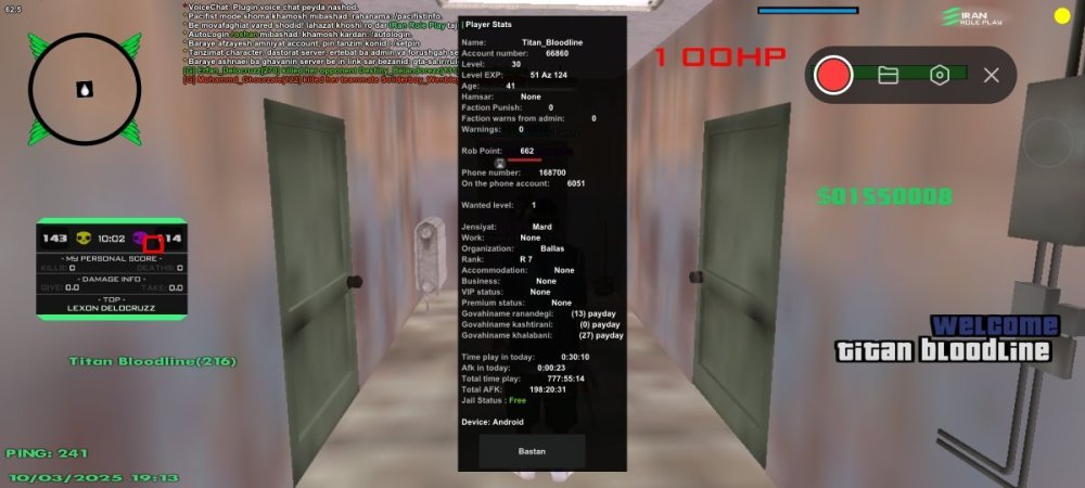 نام شما در بازی:Titan_Bloodline نام پلیری که شما از ایشان شکایت دارید:Erfan_Nostalgia اطلاعات اکانت شما (Level، رنک و فکشن فعلی شما در سرور):Balas R7 Level 30 توضیحات شکایت:چیت درخواست اپرا VID_20250305_222230_840.mp4